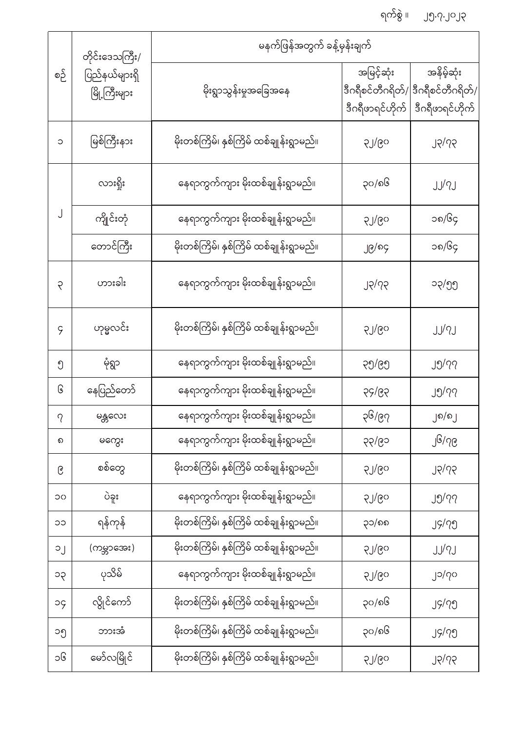 အောက်မှာဖော်ပြထားတာကတော့ မနက်ဖြန်အတွက် တိုင်းဒေသကြီးနှင့် ပြည်နယ်များရှိ မြို့ကြီးများ၏ အမြင့်ဆုံးအပူချိန်၊ အနိမ့်ဆုံးအပူချိန်