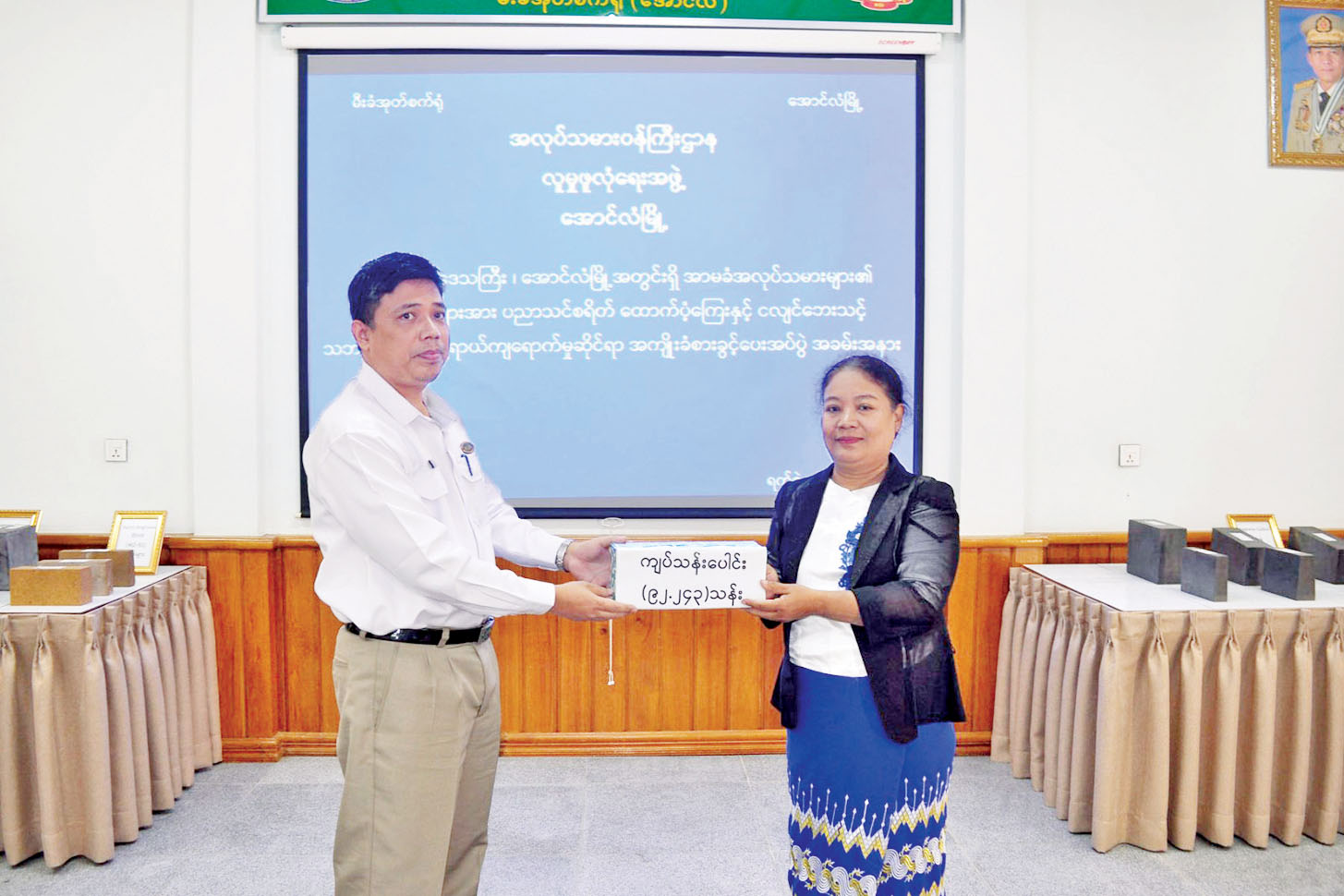 မကွေးတိုင်းဒေသကြီး အောင်လံမြို့နယ်၌ အလုပ်သမားဝန်ကြီးဌာန လူမှုဖူလုံရေးအဖွဲ့က အောင်လံမြို့နယ်အတွင်းရှိ အာမခံအလုပ်သမားများ၏ သား သမီးများအား ပညာသင်စရိတ် ထောက်ပံ့ကြေးနှင့် ငလျင်ဘေးသင့် သဘာဝဘေးအန္တရာယ်ကျရောက်မှုဆိုင်ရာ အကျိုးခံစားခွင့် ပေးအပ်ပွဲအခမ်းအနားကို ယမန်နေ့က အောင်လံမြို့ မီးခံအုတ်စက်ရုံ အစည်းအဝေးခန်းမ၌ ပြုလုပ်သည်။
