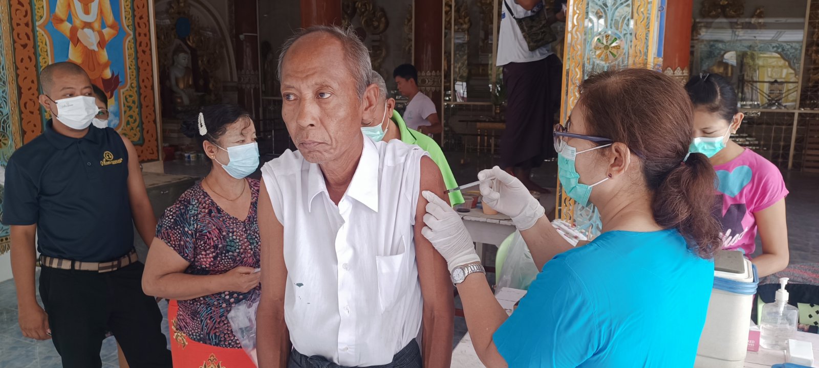 ထိုသို့ကာကွယ်ဆေးထိုးနှံပေးရာတွင် အောင်မြေသာစံမြို့နယ် ဒေါနဘွားရပ်ကွက် မုန်တိုင်ဓမ္မာရုံ၌ (၁၈၀)ဦး၊ အမရဌာနီအရှေ့ရပ်ကွက် ဒေါ်ဖီဓမ္မာရုံ၌ (၁၉၀)ဦး၊ ပြည်ကြီးရန်လုံရပ်ကွက် ကိုးခန်းဓမ္မာရုံ၌ (၃၁၀)ဦး၊ ပြည်ကြီးကျက်သရေ အနောက်ရပ်ကွက်၊ ရွှေကျီးမြင်ဘုရား ရွှေကျီးနားဓမ္မာရုံ၌ (၂၀၀)ဦး၊ ဥပုသ်တော်ရပ်ကွက် မြို့နယ်ပြည်သူ့ကျန်းမာရေးဦးစီးဌာန၌ (၁၂၀)ဦး၊ စုစုပေါင်း(၁၀၀၀)ဦးတို့ကို ကိုဗစ်-၁၉ ရောဂါကာကွယ်ဆေး (Sinopharm)ဆေးအား ထိုးနှံပေးခဲ့ကြောင်း သိရသည်။