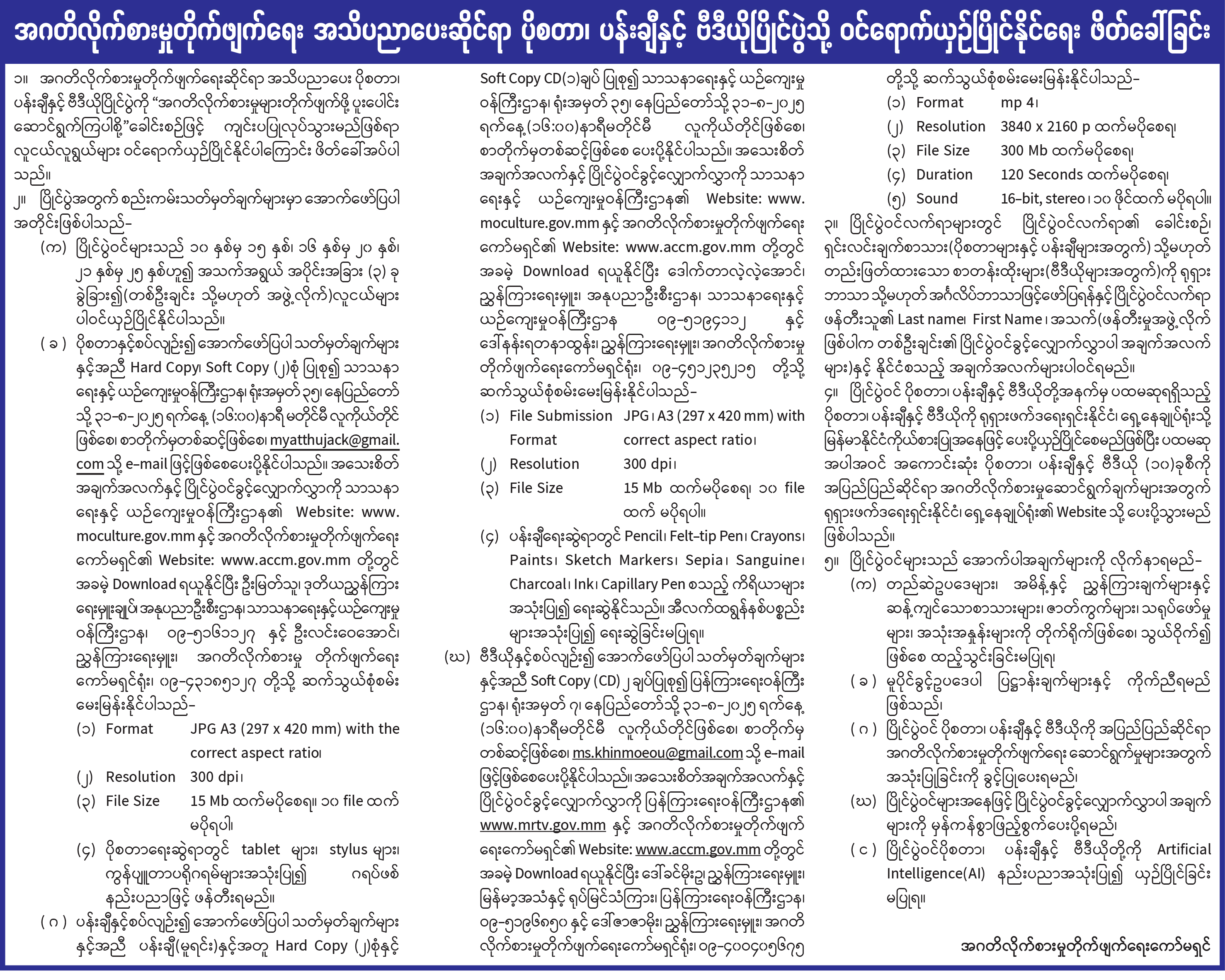 အဂတိလိုက်စားမှုတိုက်ဖျက်ရေး အသိပညာပေးဆိုင်ရာ ပိုစတာ၊ ပန်းချီနှင့် ဗီဒီယိုပြိုင်ပွဲသို့ ဝင်ရောက်ယှဉ်ပြိုင်နိုင်ရေး ဖိတ်ခေါ်ခြင်း