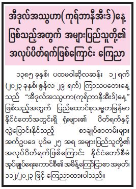 အီဒုလ်အဿွဟာ(ကုရ်ဘာနီအီးဒ်)နေ့ ဖြစ်သည့်အတွက် အများပြည်သူတို့၏ အလုပ်ပိတ်ရက်ဖြစ်ကြောင်း ကြေညာ