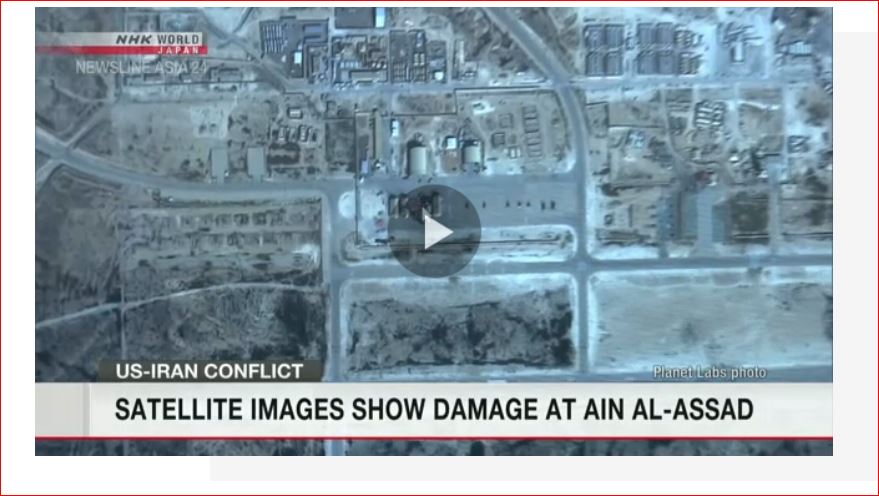 ယမန်နေ့က ဒုံးကျည်တိုက်ခိုက်မှုများပြီးနောက် နာရီအနည်းငယ်အကြာတွင် အီရတ်နိုင်ငံအနောက်ပိုင်းရှိ Ain al-Assad လေတပ်စခန်း၏ ဂြိုလ်တုပုံရိပ်များကို NHK က ရရှိခဲ့သည်ဟု ဆိုသည်။