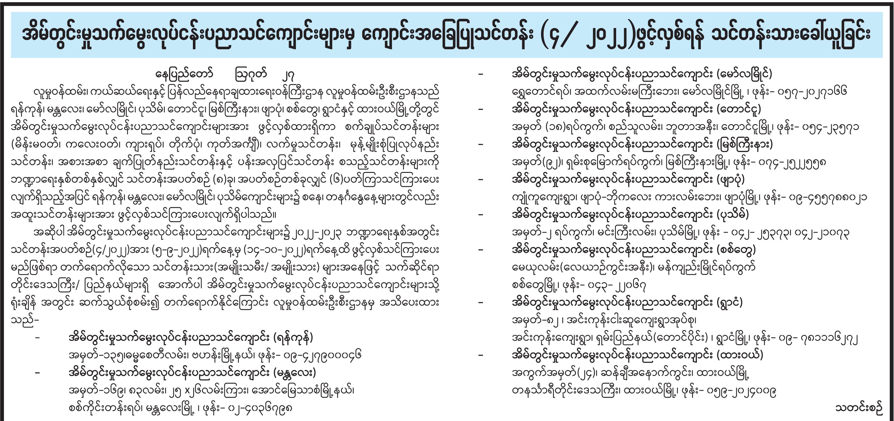 အိမ်တွင်းမှုသက်မွေးလုပ်ငန်းပညာသင်ကျောင်းများမှ ကျောင်းအခြေပြုသင်တန်း (၄/၂၀၂၂) ဖွင့်လှစ်ရန် သင်တန်းသားခေါ်ယူခြင်း