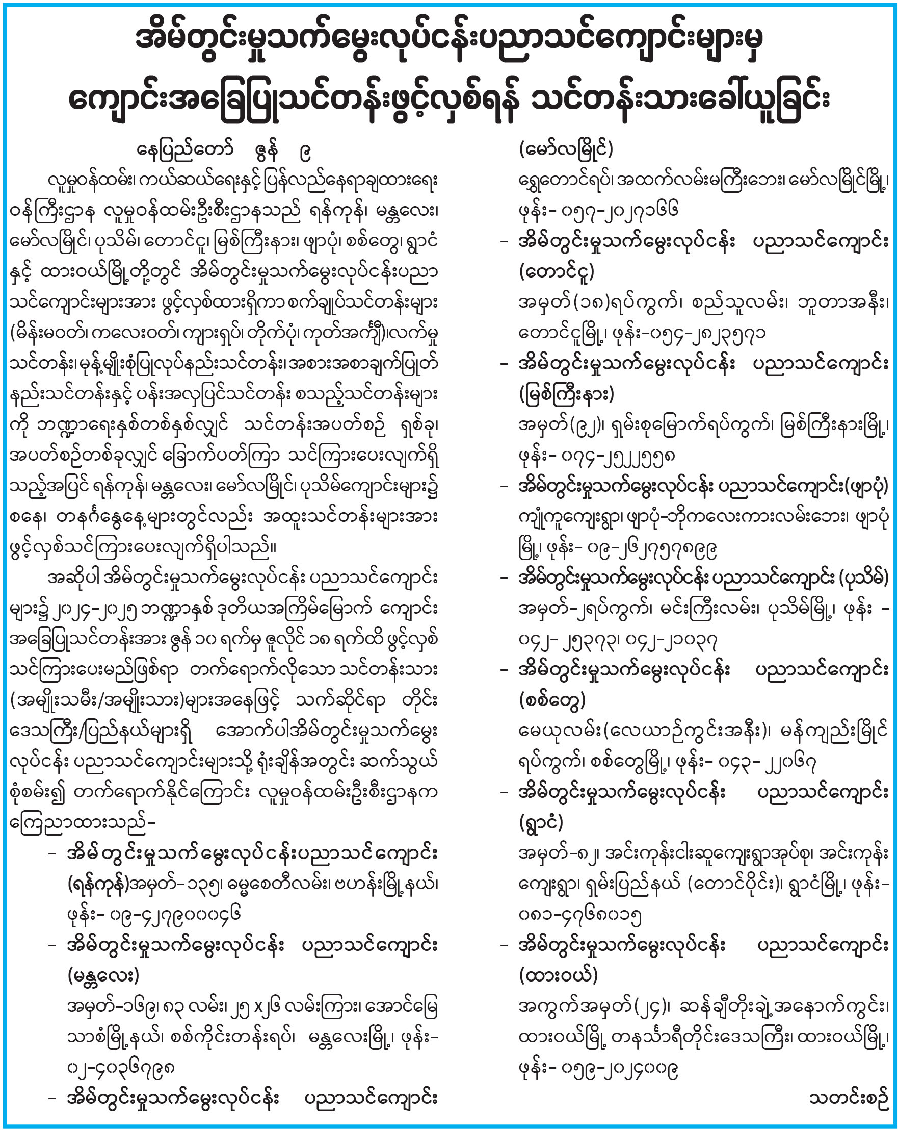 အိမ်တွင်းမှုသက်မွေးလုပ်ငန်းပညာသင်ကျောင်းများမှ ကျောင်းအခြေပြုသင်တန်းဖွင့်လှစ်ရန် သင်တန်းသားခေါ်ယူ