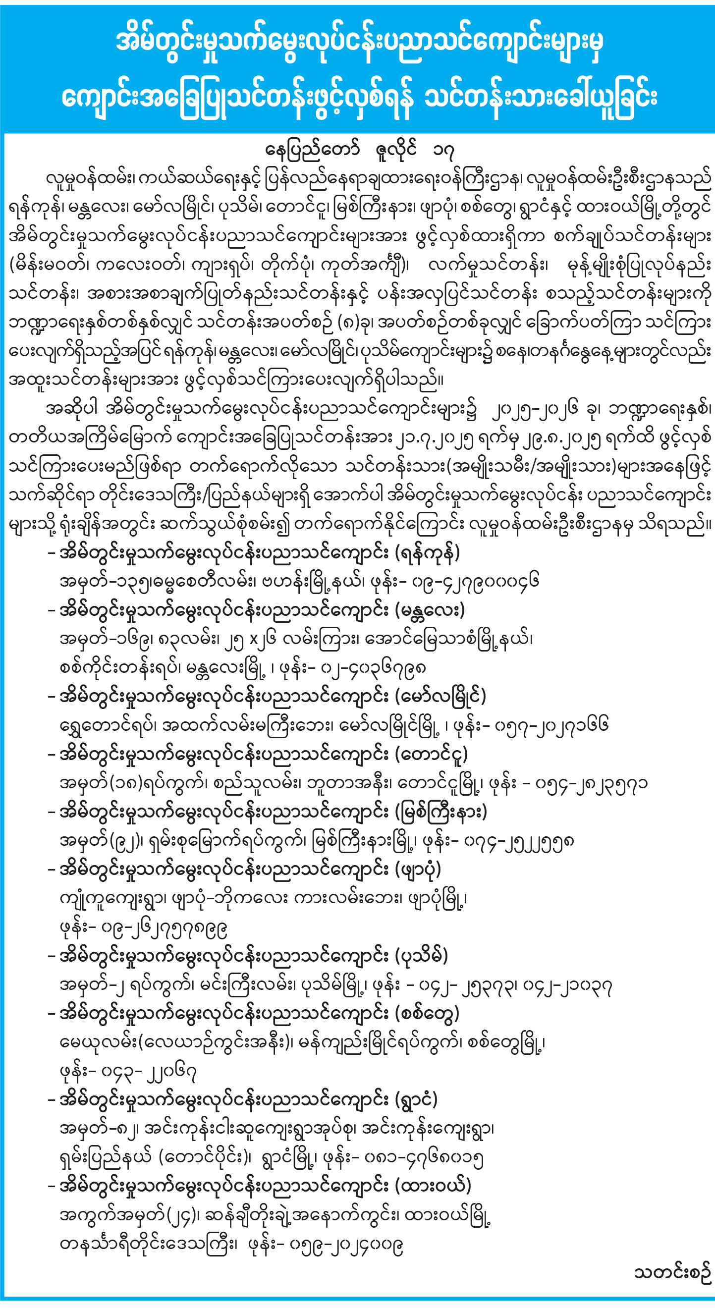 အိမ်တွင်းမှုသက်မွေးလုပ်ငန်းပညာသင်ကျောင်းများမှ ကျောင်းအခြေပြုသင်တန်းဖွင့်လှစ်ရန် သင်တန်းသားခေါ်ယူခြင်း