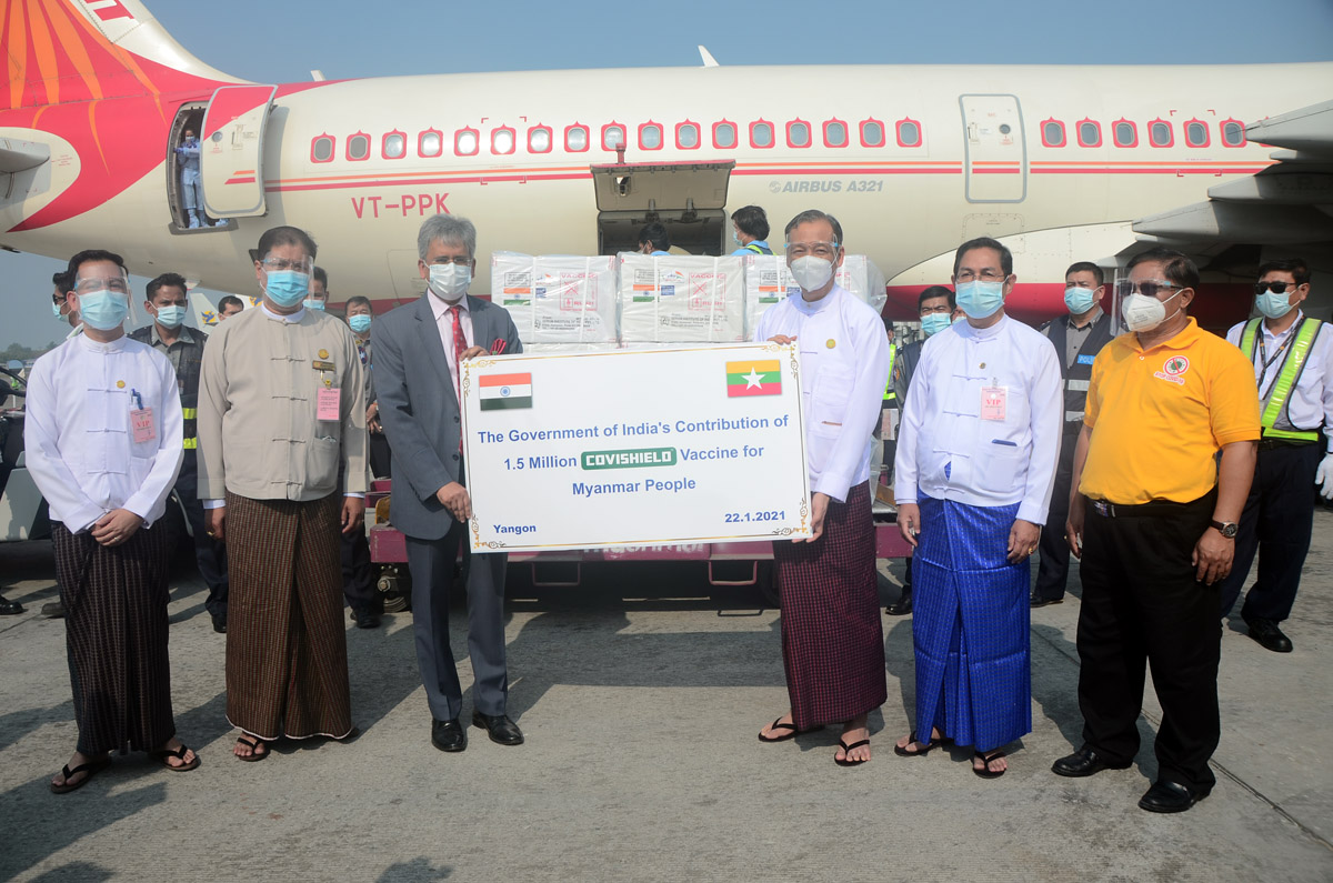 မြန်မာနိုင်ငံက ဆောင်ရွက်လျက်ရှိသည့် ကိုဗစ်-၁၉ ကာကွယ်၊ ထိန်းချုပ်၊ ကုသရေး အစီအမံ များအား အထောက်အကူပြုစေရန် ရည်ရွယ်ပြီး အိန္ဒိယအစိုးရက မြန်မာအစိုးရသို့ အိန္ဒိယ နိုင်ငံအခြေစိုက် Serum Institute of India (SII)ထုတ် ကာကွယ်ဆေး COVIDSHIELD (၁ ဒသမ ၅)သန်းကို ပထမအသုတ်အဖြစ် လှူဒါန်းခဲ့ရာ ယနေ့မွန်းလွဲ ၂ နာရီခွဲတွင် Air India လေယာဉ်ဖြင့် ရန်ကုန်အပြည်ပြည်ဆိုင်ရာလေဆိပ်သို့ ချောမောစွာ ရောက်ရှိသည်။