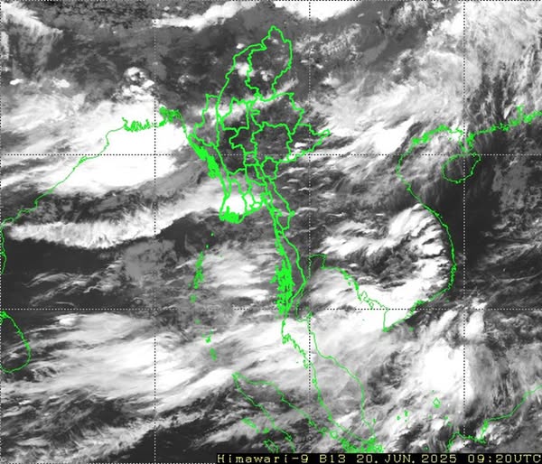 မိုးတိမ်တောင်ဖြစ်ပေါ်မှုအခြေအနေ။ ရန်ကုန်တိုင်းဒေသကြီး၊ ပဲခူးတိုင်းဒေသကြီး၊ စစ်ကိုင်းတိုင်းဒေသကြီး၊ ဧရာဝတီတိုင်းဒေသကြီး၊ တနင်္သာရီတိုင်းဒေသကြီး၊ ချင်းပြည်နယ်နှင့် ရှမ်းပြည်နယ်(အရှေ့ပိုင်း)တို့တွင် မိုးတိမ်တောင်များ ဖြစ်ထွန်းလျက်ရှိပြီး၊ အဆိုပါ မိုးတိမ်တောင်များရွေ့လျားရာနေရာတစ်လျှောက်တွင် မိုးရွာသွန်းခြင်းနှင့်အတူ လေပြင်းတိုက်ခတ်ခြင်း၊ မိုးထစ်ချုန်းခြင်း၊ မိုးကြိုးပစ်ခြင်း၊ လျှပ်စီးလက်ခြင်းနှင့် မိုးသီးကြွေခြင်းစသည့် မိုးလေဝသဖြစ်စဉ်များ ဖြစ်ပေါ်နိုင်ပါသဖြင့် ကြိုတင်သတိပြုနိုင်ပါရန် အကြံပြုအပ်ပါသည်။