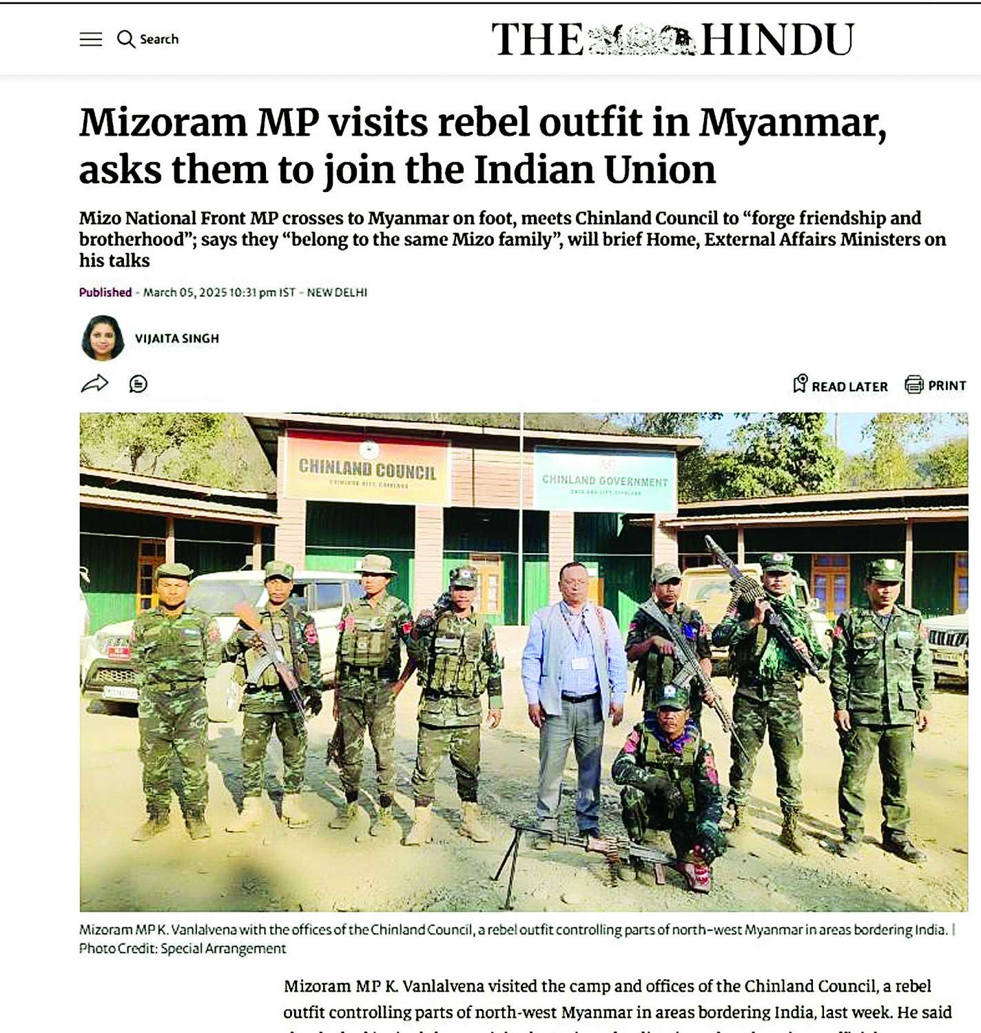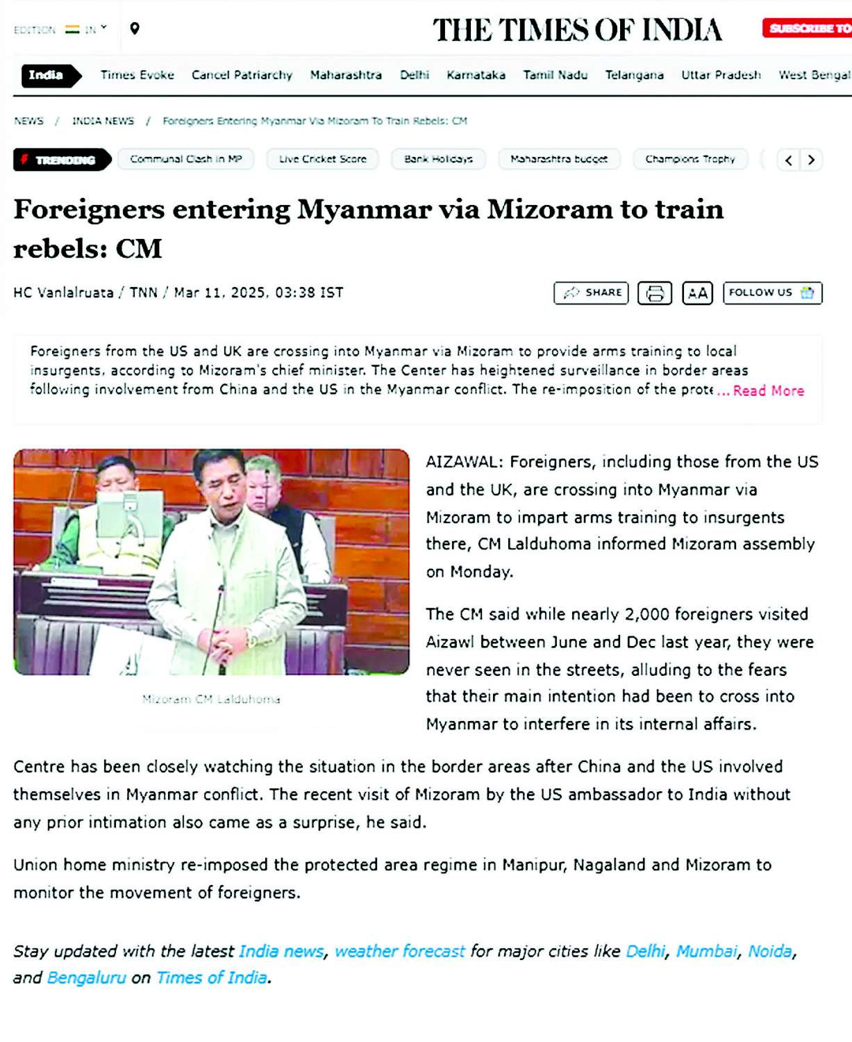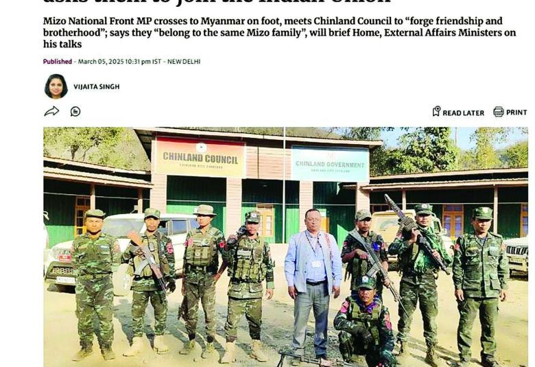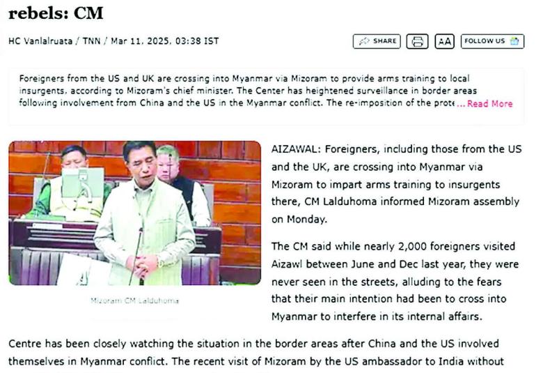 သူပြောကြားတာကတော့ K. Vanlalvena က မီဇိုရမ်ပြည်နယ်ကနေ မြန်မာနိုင်ငံအတွင်းကို နယ်စပ်ဖြတ်ကျော်ပြီး သွားရောက်ခဲ့တယ်။ အဲဒီခရီးစဉ်နဲ့ပတ်သက်ပြီး မီဇိုရမ်ပြည်နယ် အုပ်ချုပ်ရေးမှူးနဲ့ နယ်ခြားစောင့်တပ်ကို အသိပေးအကြောင်းကြားခဲ့တယ် ဆိုပြီးတော့လည်း The Hindu သတင်း Website က ဖော်ပြထားတာကို တွေ့ရပါတယ်။ ပြီးရင် CNF၊ CNA ချင်းPDF အဖွဲ့တွေနဲ့တွေ့ဆုံခဲ့တယ်ဆိုပြီးလည်း ပြောကြားထားတာကို ကျွန်တော်တို့တွေ့ရပါတယ်။ ဒါ့အပြင် အိန္ဒိယ - မြန်မာနယ်စပ်ချင်းနယ်စပ် ဆက်စပ်တဲ့နေရာပေါ့။ တမူး-ကဘော်ချိုင့်ဝှမ်းဒေသနဲ့ပတ်သက်ပြီးလည်း အိန္ဒိယအထက်လွှတ်တော်အစည်းအဝေးမှာ မဏိပူရပြည်နယ် ပါလီမန်လွှတ်တော်အမတ်တစ်ဦးကနေပြီး ဒီဟာနဲ့ပတ်သက်ပြီး ယခင်သမိုင်းကြောင်းအရ အိန္ဒိယဘက်က ပိုင်တယ်ဆိုတဲ့ သဘောမျိုးပြောကြားခဲ့တာကို တွေ့ရပါတယ်။ ဒါ့အပြင် မီဇိုရမ်ပြည်နယ်ကနေတစ်ဆင့် မြန်မာနိုင်ငံထဲကို ဝင်ရောက်လာတဲ့ နိုင်ငံခြားသားများ ကိစ္စနဲ့ပတ်သက်ပြီး ဒီလ ၁၀ ရက်နေ့မှာ မီဇိုရမ်ပြည်နယ်ဝန်ကြီးချုပ် Lalduhoma က မီဇိုရမ်ပြည်နယ်လွှတ်တော်မှာ ပြောကြားခဲ့တာကို တွေ့ရပါတယ်။