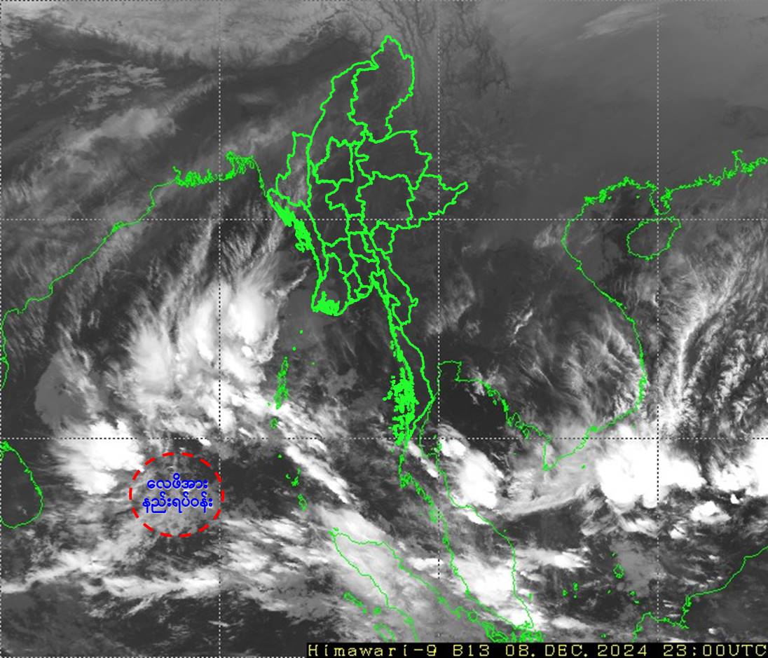 မိုးလေဝသနှင့်ဇလဗေဒ ညွှန်ကြားမှုဦးစီးဌာနက ယနေ့နံနက် ၇ နာရီ ထုတ်ပြန်သည့် မိုးလေဝသ သတင်းအရ ဘင်္ဂလား ပင်လယ်အော်တောင်ပိုင်းနှင့် ယင်းနှင့်ဆက်စပ်လျက်ရှိသော အီကွေတာအနီး အိန္ဒိယသမုဒ္ဒရာအရှေ့ပိုင်းတို့တွင် ဖြစ်ပေါ်နေသော လေဖိအားနည်းရပ်ဝန်း (Low Pressure Area) သည် ဆက်လက်တည်ရှိနေသည်။ အဆိုပါ လေဖိအားနည်းရပ်ဝန်းသည် အနောက်-အနောက်မြောက်ဘက်သို့ ရွေ့လျားနိုင်ပြီး၊ နောက်(၂၄) နာရီအတွင်း ပိုမိုအားကောင်းလာနိုင်ကာ၊ ၁၁-၁၂-၂၀၂၄ ရက်နေ့တွင် ဘင်္ဂလားပင်လယ်အော် အနောက်တောင်ပိုင်း (သီရိလင်္ကာ နိုင်ငံကမ်းလွန်-အိန္ဒိယနိုင်ငံ၊ တမီးလ်နာဒူးကမ်းခြေ) သို့ ရောက်ရှိနိုင်သည်ဟု ခန့်မှန်းရသည်။ ကပ္ပလီပင်လယ်ပြင် တောင်ပိုင်း၊ ဘင်္ဂလားပင်လယ်အော် တောင်ပိုင်းနှင့် အရှေ့အလယ်ပိုင်းတို့တွင် တိမ်ထူထပ်နေပြီး၊ ကပ္ပလီပင်လယ်ပြင် မြောက်ပိုင်းနှင့် ကျန်ဘင်္ဂလားပင်လယ်အော်တို့တွင် တိမ်အသင့်အတင့် ဖြစ်ထွန်းနေသည်။