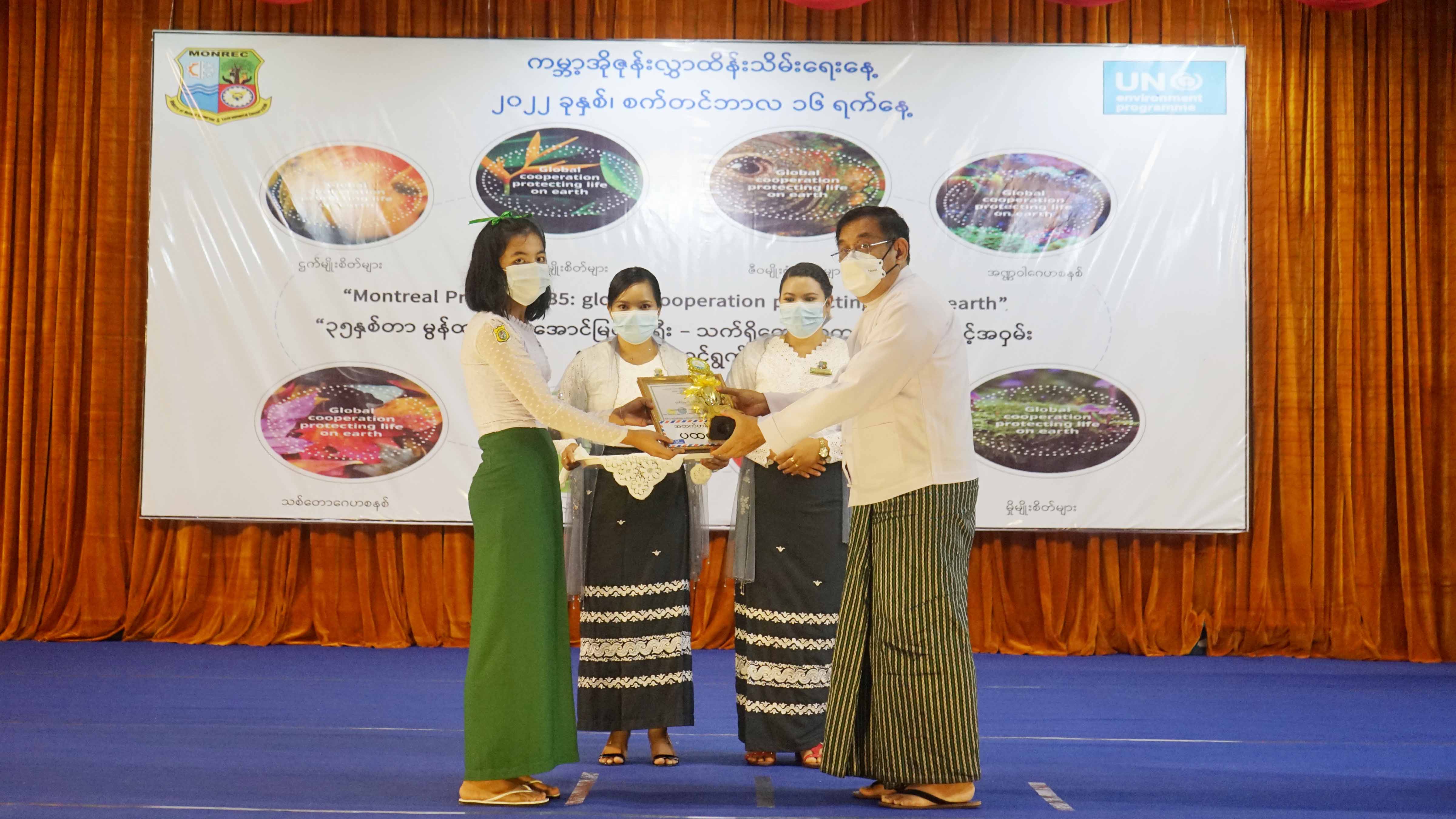 ထို့နောက် တိုင်းဒေသကြီး သယံဇာတရေးရာဝန်ကြီး ဦးခင်မောင်မြင့်က ကုလသမဂ္ဂ အထွေထွေ အတွင်းရေးမှူးချုပ်၏ သဝဏ်လွှာကိုဖတ်ကြားကာ တိုင်းဒေသကြီးဝန်ကြီးချုပ် ဦးမြတ်ကိုနှင့် တာဝန်ရှိသူများက ကမ္ဘာ့အိုဇုန်းလွှာ ထိန်းသိမ်းရေးနေ့အထိမ်းအမှတ် အခြေခံပညာ အလယ်တန်းအဆင့်နှင့် အထက်တန်းအဆင့် သရုပ်ဖော်ပန်းချီနှင့် စာစီစာကုံး ဆုရရှိသူများအား ဆုများပေးအပ်ချီးမြှင့်ပြီး ပတ်ဝန်းကျင်ထိန်းသိမ်းရေး ဦးစီးဌာနမှ ပြသသော အသိပညာပေးဗီဒီယိုနှင့် ပြခန်းများကို ကြည့်ရှုအားပေးခဲ့ကြောင်း သိရသည်။