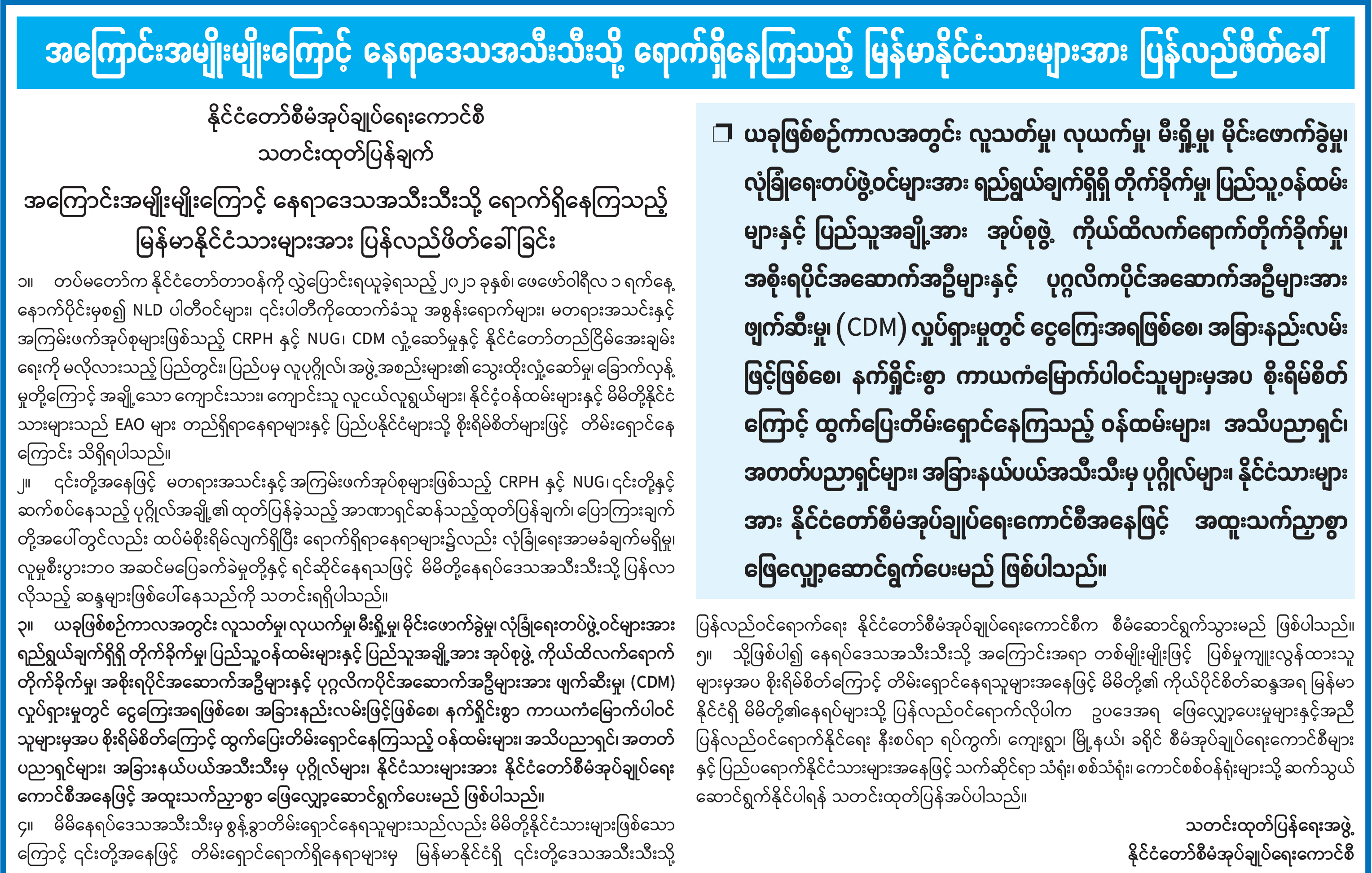 အကြောင်းအမျိုးမျိုးကြောင့် နေရာဒေသအသီးသီးသို့ ရောက်ရှိနေကြသည့် မြန်မာနိုင်ငံသားများအား ပြန်လည်ဖိတ်ခေါ်