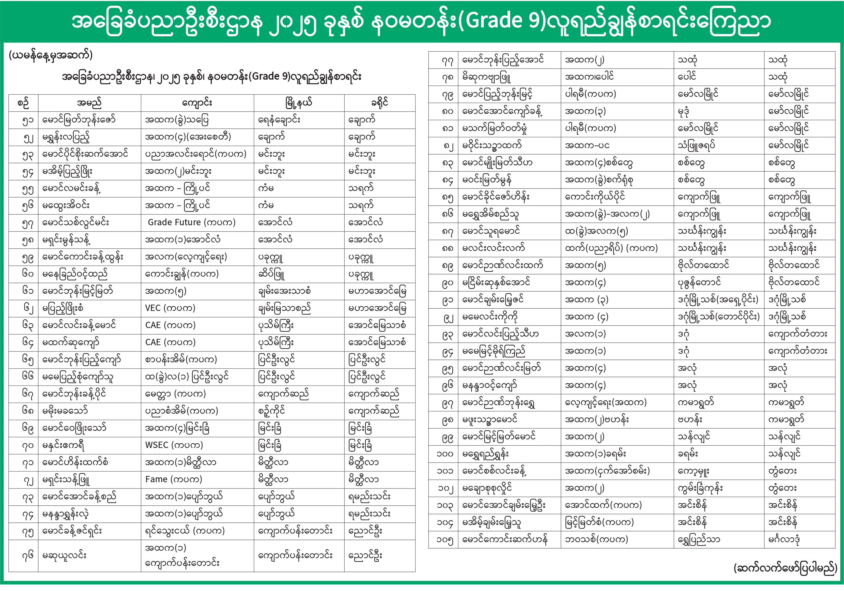 အခြေခံပညာဦးစီးဌာန ၂၀၂၅ ခုနှစ် နဝမတန်း (Grade 9) လူရည်ချွန်စာရင်း ကြေညာ