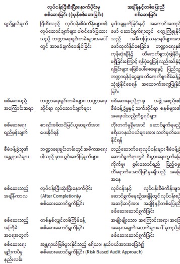 အဆိုပါ စစ်ဆေးရေးအမျိုးအစားများအနက် ဘဏ္ဍာရေးရှင်းတမ်းစစ်ဆေးခြင်းသည် ဌာနအဖွဲ့ အစည်းများ၏ ဘဏ္ဍာရေးရှင်းတမ်းများအား နှစ်စဉ်ပုံမှန်စစ်ဆေးရသည့် Regulatory Audit အမျိုးအစား ဖြစ်ပြီး ဌာနအဖွဲ့အစည်းများက ဘဏ္ဍာနှစ်တစ်နှစ်အတွင်း လုပ်ငန်းဆောင်ရွက်ချက်များကို မှတ်တမ်းတင် ထားသည့် စာရင်း၊ အထောက်အထားများကို စစ်ဆေးရေးဝန်ထမ်းအင်အား၊ ရရှိသည့်အချိန် အစရှိသည့် စွမ်းအားစုများအပေါ်မူတည်၍ နှစ်ချုပ်စာရင်းများတွင် မှားယွင်းဖော်ပြမှု၊ မသမာမှု၊ လိမ်လည်မှု၊ အလွဲသုံးစားမှုများရှိနိုင်သည့်၊ အန္တရာယ်ဖြစ်ပေါ်နိုင်သည့် အခြေအနေများကို စိစစ်အကဲဖြတ်၍ စစ်ဆေးဆောင်ရွက်ရသည့် Risk based Approach ဖြင့် ကောက်နုတ်ရွေးချယ်စစ်ဆေးခြင်း ဖြစ်ပါသည်။