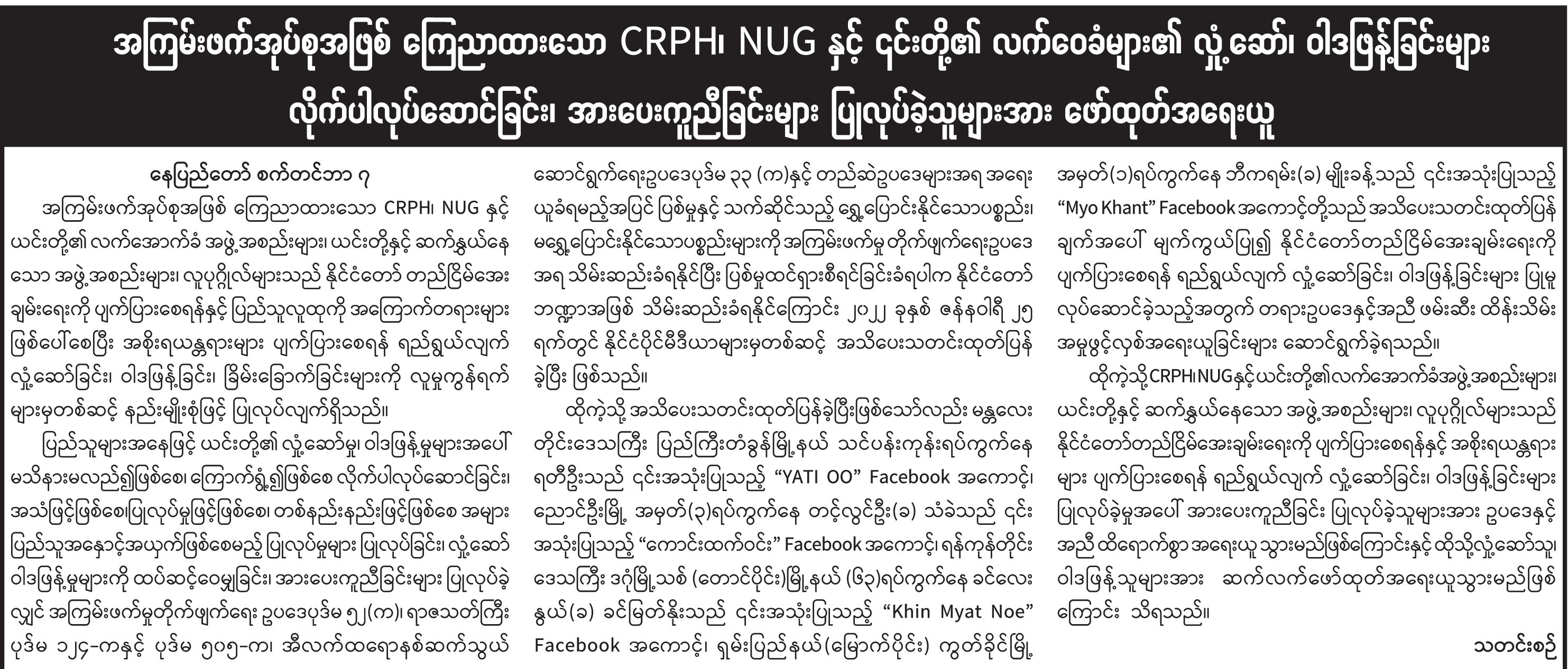 အကြမ်းဖက်အုပ်စုအဖြစ် ကြေညာထားသော CRPH ၊ NUG နှင့် ၎င်းတို့၏ လက်ဝေခံများ၏ လှုံ့ဆော်၊ ဝါဒဖြန့်ခြင်းများ လိုက်ပါလုပ်ဆောင်ခြင်း၊ အားပေးကူညီခြင်းများ ပြုလုပ်ခဲ့သူများအား ဖော်ထုတ်အရေးယူ
