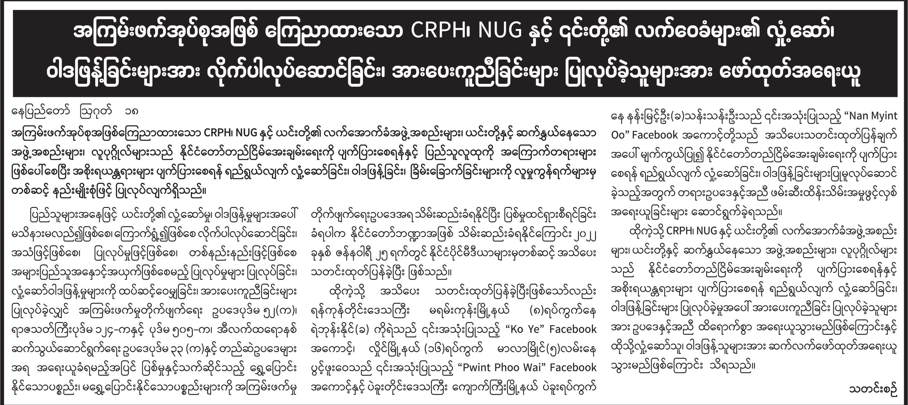အကြမ်းဖက်အုပ်စုအဖြစ် ကြေညာထားသော CRPH၊ NUG နှင့် ၎င်းတို့၏ လက်ဝေခံများ၏ လှုံ့ဆော်၊ ဝါဒဖြန့်ခြင်းများအား လိုက်ပါလုပ်ဆောင်ခြင်း၊ အားပေးကူညီခြင်းများ ပြုလုပ်ခဲ့သူများအား ဖော်ထုတ်အရေးယူ