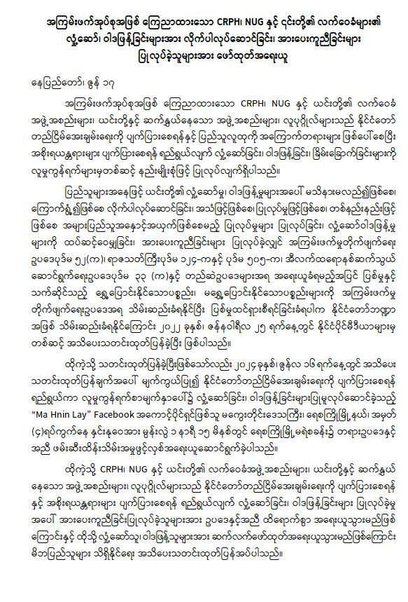 အကြမ်းဖက်အုပ်စုအဖြစ် ကြေညာထားသော CRPH၊ NUG နှင့် ၎င်းတို့၏ လက်ဝေခံများ၏ လှုံ့ဆော်၊ ဝါဒဖြန့်ခြင်းများအား လိုက်ပါလုပ်ဆောင်ခြင်း၊ အားပေးကူညီခြင်းများ ပြုလုပ်ခဲ့သူများအား ဖော်ထုတ်အရေးယူ