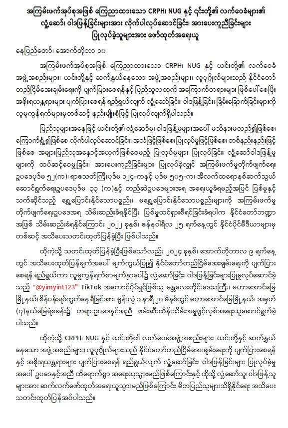 အကြမ်းဖက်အုပ်စုအဖြစ် ကြေညာထားသော CRPH၊ NUG နှင့် ၎င်းတို့၏ လက်ဝေခံများ၏ လှုံ့ဆော်၊ ဝါဒဖြန့်ခြင်းများအား လိုက်ပါလုပ်ဆောင်ခြင်း၊ အားပေးကူညီခြင်းများ ပြုလုပ်ခဲ့သူများအား ဖော်ထုတ်အရေးယူ