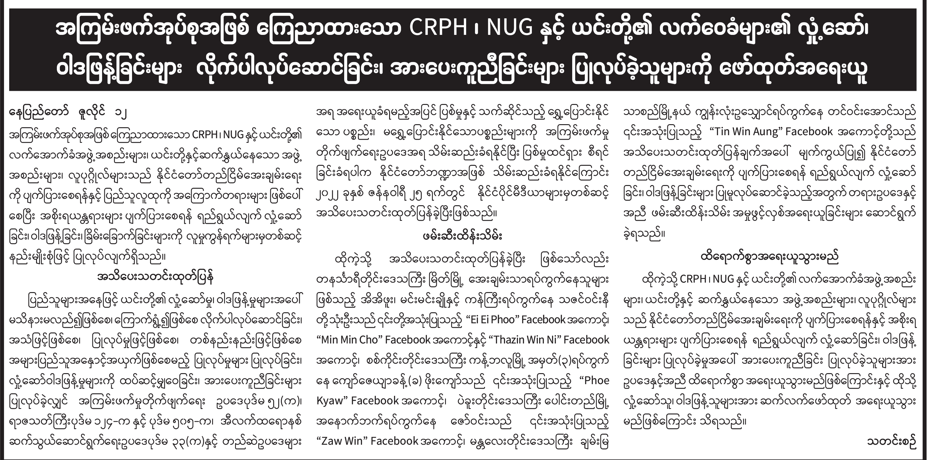 အကြမ်းဖက်အုပ်စုအဖြစ် ကြေညာထားသော CRPH ၊ NUG နှင့် ယင်းတို့၏ လက်ဝေခံများ၏ လှုံ့ဆော်၊ ဝါဒဖြန့်ခြင်းများ လိုက်ပါလုပ်ဆောင်ခြင်း၊ အားပေးကူညီခြင်းများ ပြုလုပ်ခဲ့သူများကို ဖော်ထုတ်အရေးယူ