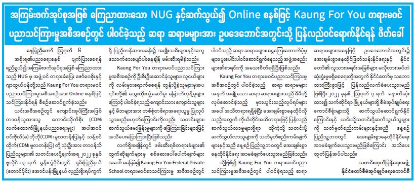 အကြမ်းဖက်အုပ်စုအဖြစ် ကြေညာထားသော NUG နှင့်ဆက်သွယ်၍ Online စနစ်ဖြင့် Kaung For You တရားမဝင် ပညာသင်ကြားမှုအစီအစဉ်တွင် ပါဝင်ခဲ့သည့် ဆရာ ဆရာမများအား ဥပဒေဘောင်အတွင်းသို့ ပြန်လည်ဝင်ရောက်နိုင်ရန် ဖိတ်ခေါ်