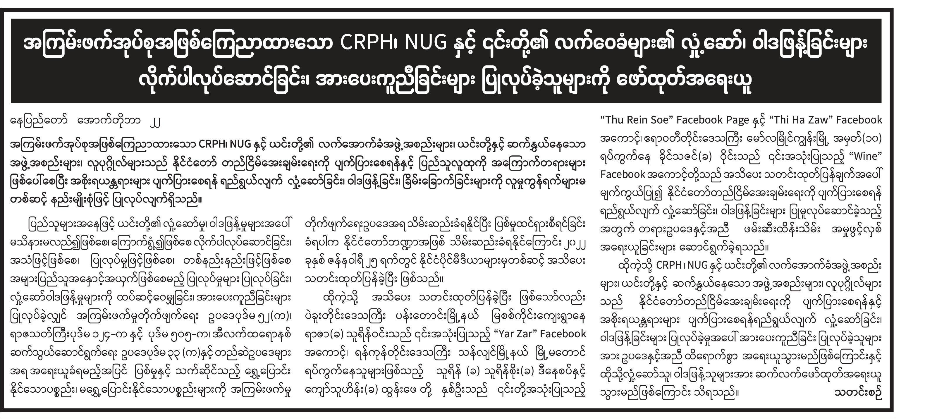 အကြမ်းဖက်အုပ်စုအဖြစ်ကြေညာထားသော CRPH ၊ NUG နှင့် ၎င်းတို့၏ လက်ဝေခံများ၏ လှုံ့ဆော်၊ ဝါဒဖြန့်ခြင်းများ လိုက်ပါလုပ်ဆောင်ခြင်း၊ အားပေးကူညီခြင်းများ ပြုလုပ်ခဲ့သူများကို ဖော်ထုတ်အရေးယူ