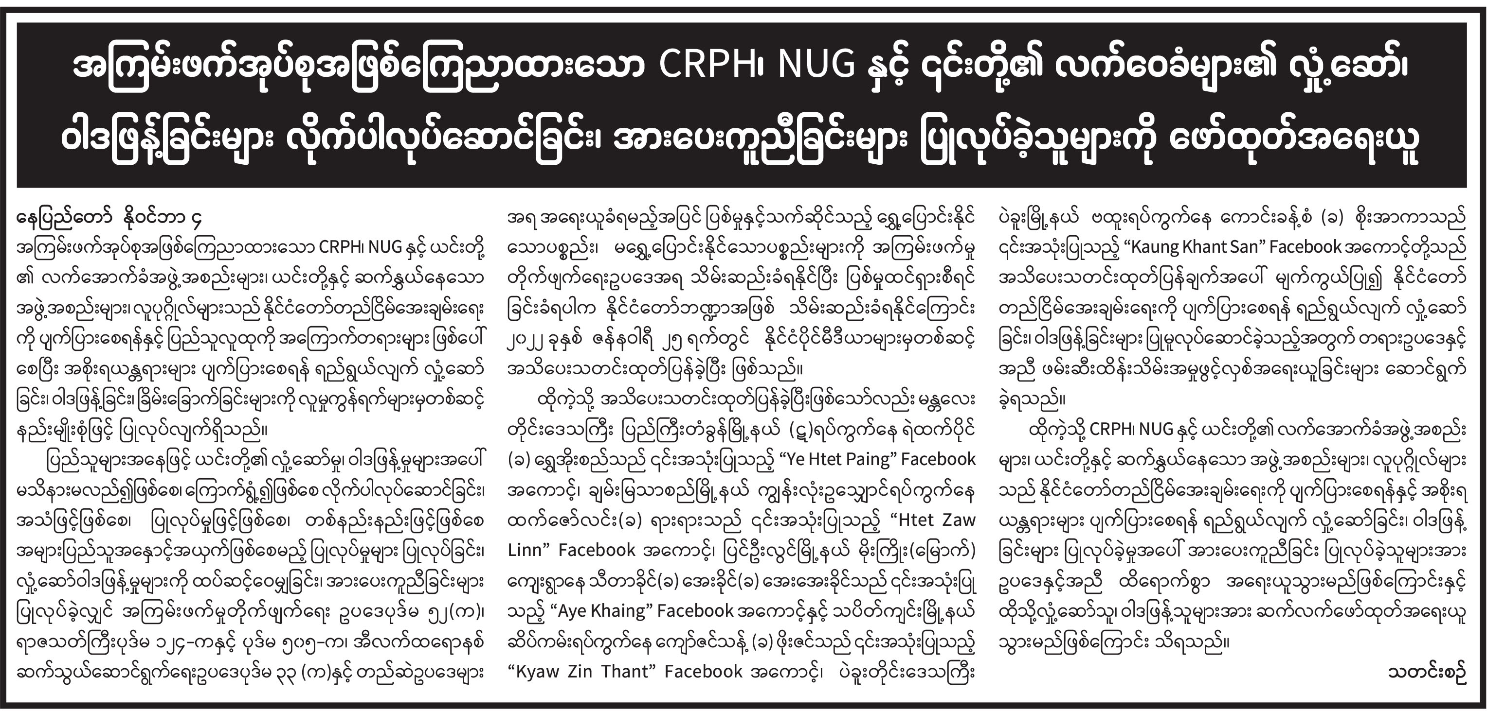 အကြမ်းဖက်အုပ်စုအဖြစ်ကြေညာထားသော CRPH ၊ NUG တို့နှင့် ၎င်းတို့၏ လက်ဝေခံများ၏ လှုံ့ဆော်၊ ဝါဒဖြန့်ခြင်းများ လိုက်ပါလုပ်ဆောင်ခြင်း၊ အားပေးကူညီခြင်းများ ပြုလုပ်ခဲ့သူများကို ဖော်ထုတ်အရေးယူ