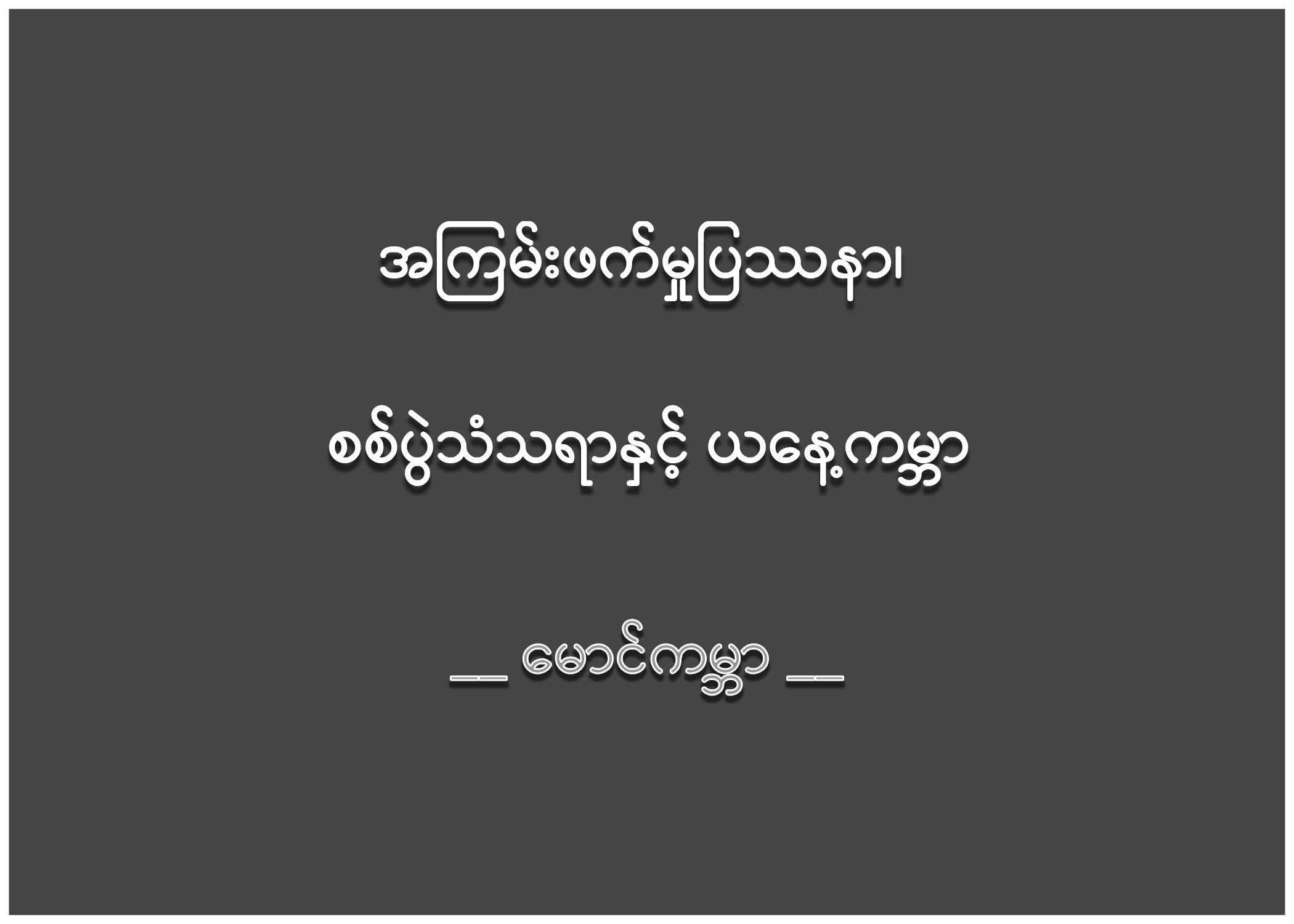 စစ်သွေးကြွများ၊ စစ်လိုလားသူစစ်ဝါဒီများ၊ စစ်ဘုရင်များ၊ စစ်ပွဲကိုအကြောင်းပြု၍ အကျိုးအမြတ်ရရှိနေသူများ၊ လူမျိုးစွဲ၊ ဘာသာစွဲ အမြင်ကျဉ်းမြောင်းသူများ ရှိနေသမျှ ယနေ့ကမ္ဘာသည် အကြမ်းဖက်မှု ပြဿနာနှင့်စစ်ပွဲသံသရာကြားတွင် တဝဲလည်လည် လုံးလည်လိုက် ကြုံတွေ့နေဦးမည်သာ။