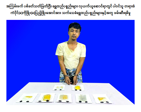 မန္တလေးတိုင်းဒေသကြီး၊ အောင်မြေသာစံမြို့နယ်တွင် ရွှေပန်းတိမ်လုပ်ငန်းလုပ်ကိုင်သူအား အကြမ်းဖက်ပစ်ခတ်သတ်ဖြတ်ပြီး ရွှေထည်ပစ္စည်းများ လုယက်ယူဆောင်ရာတွင် ပါဝင်ခဲ့သည့် တရားခံတစ်ဦးအား သက်သေခံရွှေထည်ပစ္စည်းများနှင့်အတူ ဖော်ထုတ်ဖမ်းဆီးရမိ