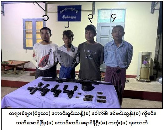 ဆက်လက်၍ လုံခြုံရေးတပ်ဖွဲ့ဝင်များက အဆိုပါနယ်မြေအား ပိတ်ဆို့ရှင်းလင်းခြင်းဆောင်ရွက်ခဲ့ရာ မေလ ၅ ရက် နံနက် ၂ နာရီ ၄၅ မိနစ်တွင် အဆိုပါရပ်ကွက်၊ သုဗောဓာရုံကျောင်းလမ်း လမ်းသွယ်အရောက်၌ မုံရွာမြို့၊ မြို့သစ်ရပ်ကွက်နေ ဇင်ကိုလင်း (ခ) သားချော (၃၃)နှစ်၊ (ဘ) ဦးအောင်ကျော်သန်းနှင့် စက်မှုဇုန်ရပ်ကွက်နေ ကျော်စိုးသူ (၃၃)နှစ်၊(ဘ) ဦးကျော်မျိုးညွှန့်တို့ ၂ ဦးအား MG-1 လက်ပစ်ဗုံး ၁ လုံး၊ ကျည်ကာအင်္ကျီ ၁ ထည်၊ ဆိုင်ကယ် ၁ စီးတို့နှင့်အတူ ထပ်မံဖမ်းဆီးရမိခဲ့ပြီး စစ်ကြောဖော်ထုတ်ချက်အရ သက်အောင်ဖြိုး (ခ) ကောင်းကင်၏ နေအိမ်အရှေ့ မြေကြီးအတွင်းမှ ဆာလာအိတ်ဖြင့်ပတ်၍ မြှုပ်နှံထားသည့် MA-2 သေနတ် ၁ လက်၊ ဘောက်ဝိုင်း ၁ ခု၊ ၎င်းကျည် ၄၆ တောင့်၊ လက်လုပ်သေနတ် ၂ လက် (ကျည်အိမ်တပ်လျက်)၊ ၎င်းကျည် ၄ တောင်၊ 91 လက်ပစ်ဗုံး ၁ လုံးတို့အား ဖော်ထုတ်သိမ်းဆည်းရရှိခဲ့သည်။