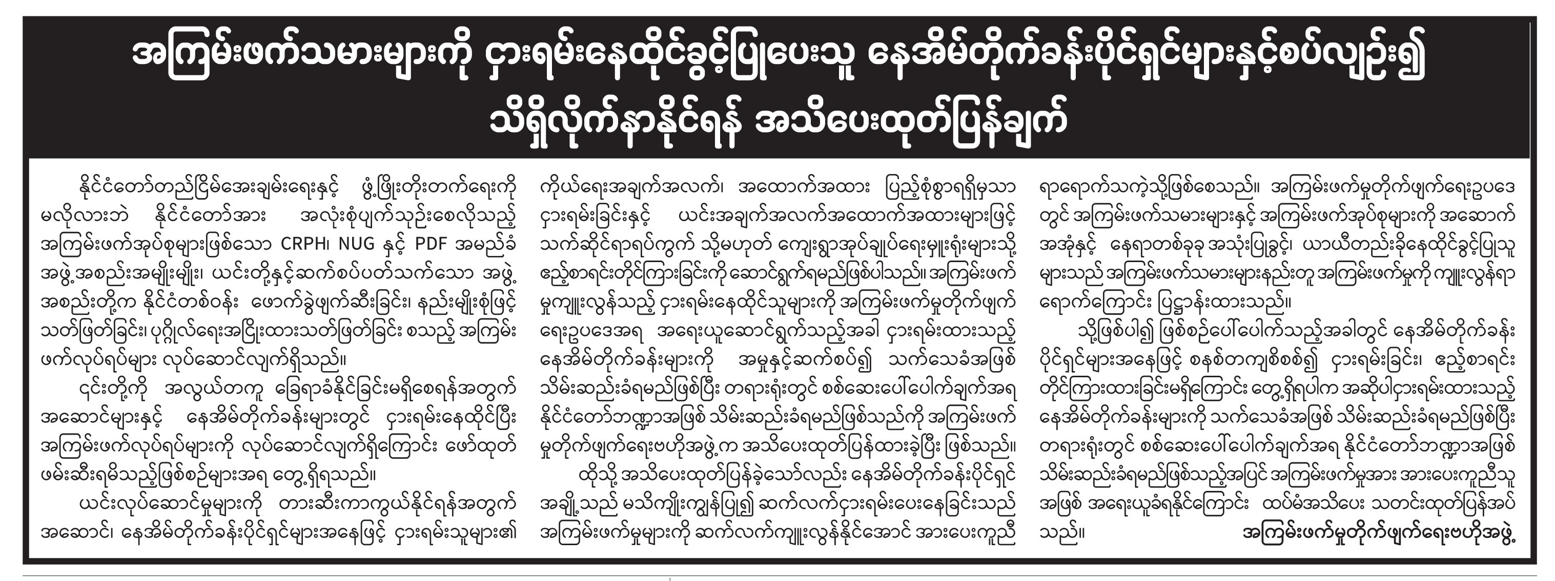 အကြမ်းဖက်သမားများကို ငှားရမ်းနေထိုင်ခွင့်ပြုပေးသူ နေအိမ်တိုက်ခန်းပိုင်ရှင်များနှင့်စပ်လျဉ်း၍ သိရှိလိုက်နာနိုင်ရန် အသိပေးထုတ်ပြန်ချက်