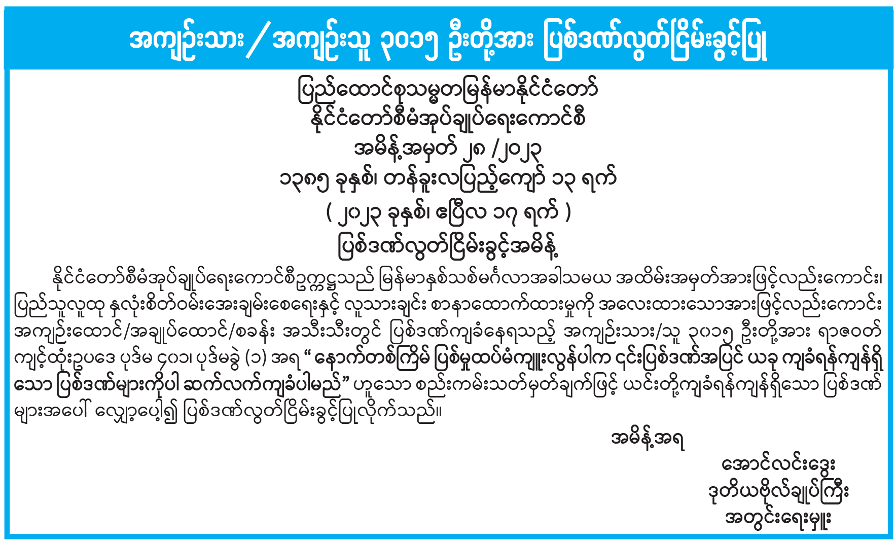 အကျဉ်းထောင်/ အချုပ်ထောင်/ စခန်း အသီးသီးတွင် ပြစ်ဒဏ်ကျခံနေရသည့် အကျဉ်းသား/သူ ၃၀၁၅ ဦးတို့အား ကျခံရန်ကျန်ရှိသော ပြစ်ဒဏ်များအပေါ် လျှော့ပေါ့၍ ပြစ်ဒဏ်လွတ်ငြိမ်းခွင့်ပြု