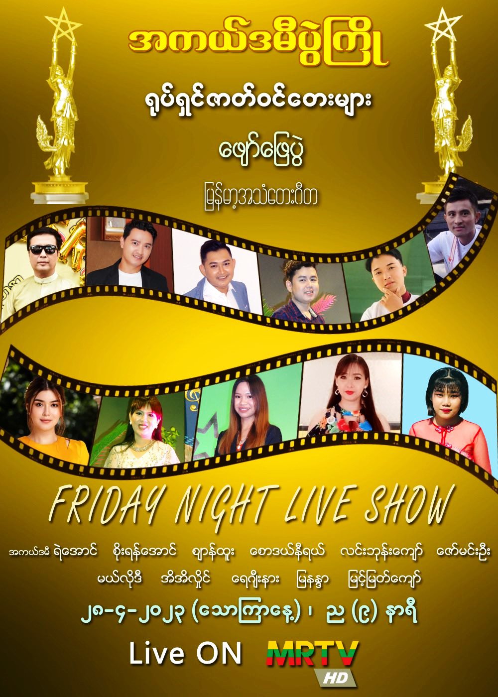 ပြည်သူများ အပန်းပြေစေရန်၊ ပျော်ရွှင်စေရန်နှင့် စိတ်ခွန်အားသစ်များ ရရှိနိုင်ရန်အတွက် မြန်မာ့အသံနှင့် ရုပ်မြင်သံကြားမှ ဖျော်ဖြေရေးအစီအစဉ်များကို တိုးမြှင့်တင်ဆက်လျက်ရှိရာ Friday Night Live Show အစီအစဉ် ဆန်းသစ်မှုအဖြစ် “အကယ်ဒမီပွဲကြို” ရုပ်ရှင်ဇာတ်ဝင်တေးများ ဖျော်ဖြေပွဲကို ဧပြီ (၂၈) ရက်၊ သောကြာနေ့ ည(၈)နာရီ သတင်းများအပြီးတွင် MRTV-HD Channel မှ ထုတ်လွှင့်ပြသမည်ဖြစ်သည်။
