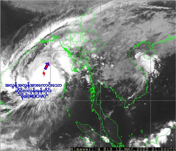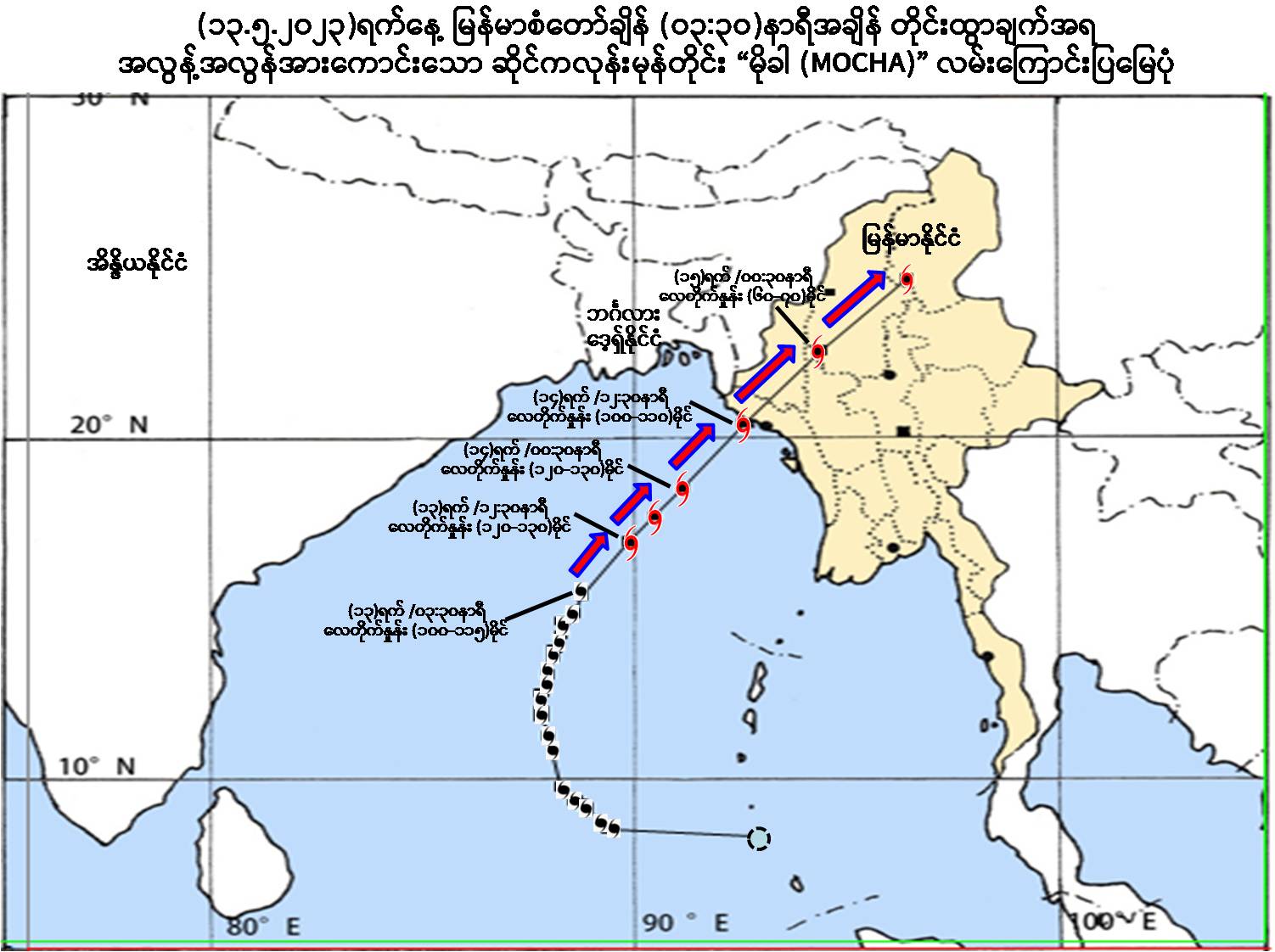 (၁) ယနေ့မြန်မာစံတော်ချိန် (၀၃:၃၀)နာရီအချိန် တိုင်းထွာချက်များအရ ဘင်္ဂလား ပင်လယ်အော်အလယ်ပိုင်းတွင် ဖြစ်ပေါ်နေသော အားအလွန်ကောင်းသော ဆိုင်ကလုန်းမုန်တိုင်း(Very Severe Cyclonic Storm) “မိုခါ” (MOCHA)သည် မြောက်-အရှေ့မြောက်ဘက်သို့ ရွေ့လျားခဲ့ပြီး၊ ပိုမိုအားကောင်းလာကာ ဘင်္ဂလား ပင်လယ်အော်အရှေ့အလယ်ပိုင်းတွင် အလွန့်အလွန်အားကောင်းသောဆိုင် ကလုန်းမုန်တိုင်း(Extremely Severe Cyclonic Storm)အဖြစ်သို့ ရောက်ရှိခဲ့ပြီး၊ မြန်မာနိုင်ငံ၊ ကိုကိုးကျွန်းမြို့(Coco Island)၏ အနောက်-အနောက် မြောက်ဘက် ရေမိုင်(၂၇၀)မိုင်ခန့်၊ ဟိုင်းကြီးကျွန်းမြို့(Hainggyigyun) ၏ အနောက်-အနောက်တောင်ဘက် ရေမိုင်(၃၃၀)မိုင်ခန့်၊ စစ်တွေမြို့(Sittwe)၏ အနောက်တောင်ဘက် ရေမိုင်(၃၈၀)မိုင်ခန့်၊ အိန္ဒိယနိုင်ငံ၊ ပို့ပလဲယား (Port Blair)၏ အနောက်မြောက်ဘက် ရေမိုင်(၃၁၀)မိုင်ခန့်နှင့် ဘင်္ဂလားဒေ့ရှ်နိုင်ငံ၊ ကော့ဘဇားမြို့(Cox’s Bazar)၏ တောင်-အနောက်တောင်ဘက် ရေမိုင် (၄၁၅)မိုင်ခန့်အကွာ ပင်လယ်ပြင်ကို ဗဟိုပြုနေပါသည်။