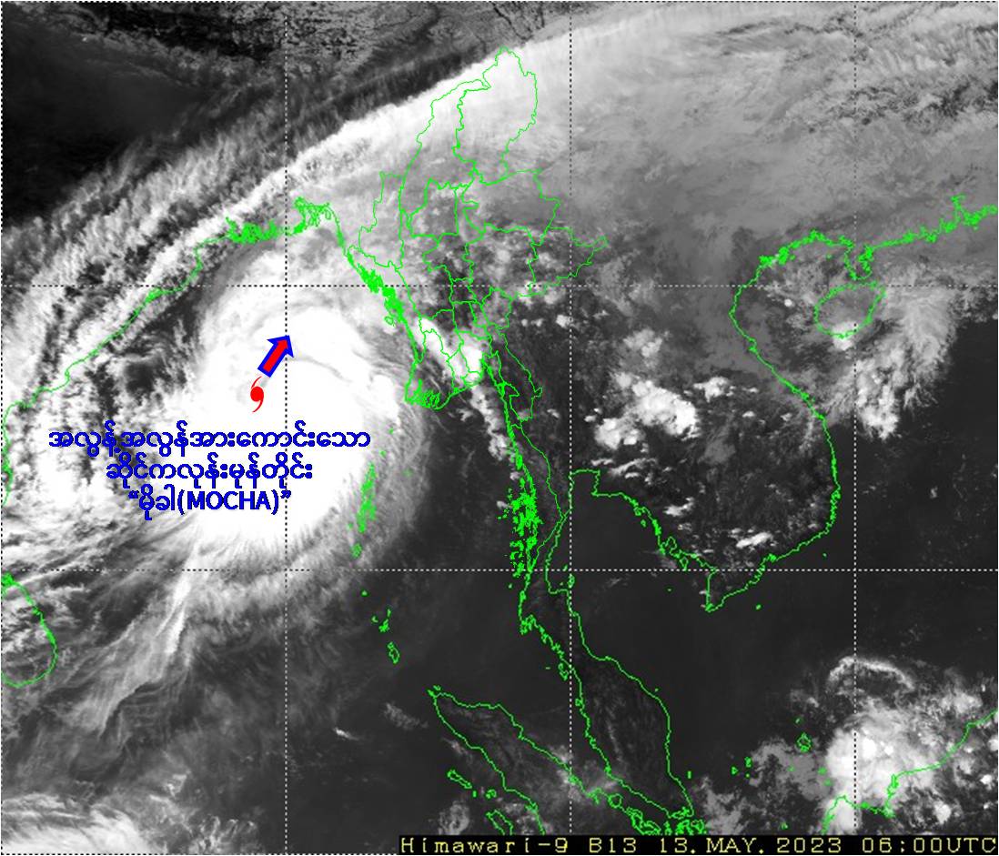(၁) ယနေ့မြန်မာစံတော်ချိန် (၁၂:၃၀)နာရီအချိန် တိုင်းထွာချက်များအရ ဘင်္ဂလားပင်လယ်အော်အရှေ့အလယ်ပိုင်းတွင် ဖြစ်ပေါ်နေသော အလွန့်အလွန်အားကောင်းသော ဆိုင်ကလုန်းမုန်တိုင်း(Extremely Severe Cyclonic Storm) “မိုခါ”(MOCHA)သည် အရှေ့မြောက်ဘက်သို့ ရွေ့လျားခဲ့ပြီး၊ မြန်မာနိုင်ငံ၊ ကိုကိုးကျွန်းမြို့(Coco Island)၏ အနောက်-အနောက်မြောက်ဘက် ရေမိုင် (၂၄၅)မိုင်ခန့်၊ ဟိုင်းကြီးကျွန်းမြို့(Hainggyigyun)၏ အနောက်ဘက် ရေမိုင်(၂၇၅)မိုင်ခန့်၊ စစ်တွေမြို့(Sittwe)၏ တောင်-အနောက်တောင်ဘက် ရေမိုင်(၃၁၀)မိုင်ခန့်၊ အိန္ဒိယနိုင်ငံ၊ ပို့ပလဲယား(Port Blair)၏ အနောက်မြောက်ဘက်ရေမိုင်(၃၂၀)မိုင်ခန့်နှင့် ဘင်္ဂလားဒေ့ရှ်နိုင်ငံ၊ ကော့ဘဇားမြို့(Cox’s Bazar)၏တောင်-အနောက်တောင်ဘက် ရေမိုင်(၃၅၅)မိုင်ခန့်အကွာ ပင်လယ်ပြင်ကို ဗဟိုပြုနေပါသည်။