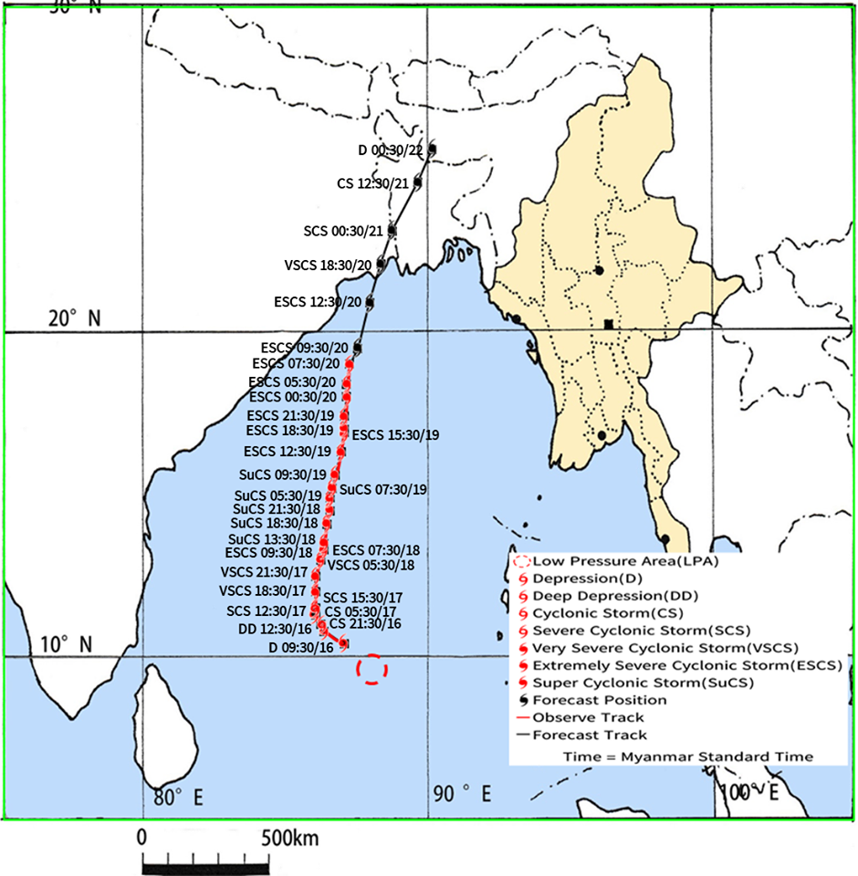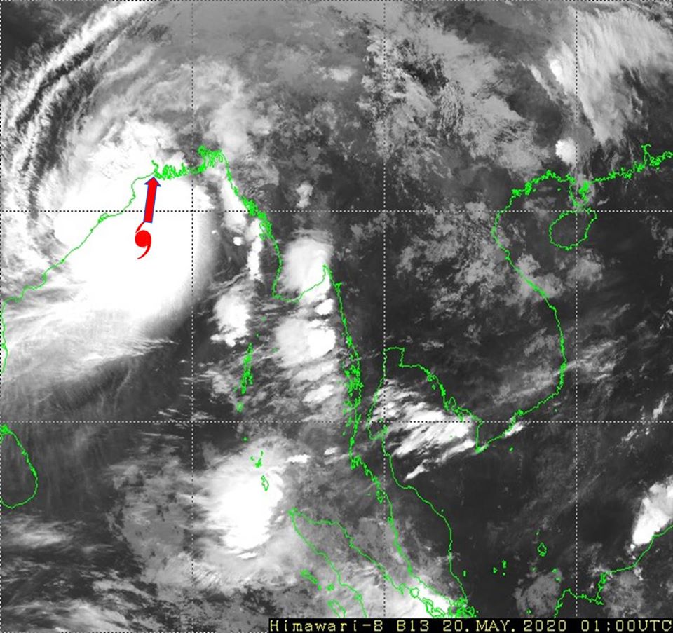 ၁။ (က) ယနေ့မြန်မာစံတော်ချိန် (၀၇:၃၀)နာရီအချိန် တိုင်းထွာချက်များအရ ဘင်္ဂလားပင်လယ် အော်အနောက်အလယ်ပိုင်းနှင့် ယင်းနှင့် ဆက်စပ်လျက်ရှိသော ဘင်္ဂလားပင်လယ်အော် အနောက်မြောက်ပိုင်းတို့တွင် ဖြစ်ပေါ်နေသော အလွန့်အလွန် အားကောင်းသောဆိုင်ကလုန်း မုန်တိုင်း(Extremely Severe Cyclonic Storm) အမ်ဖန်(AMPHAN)သည် မြောက်-အရှေ့မြောက်ဘက်သို့ ရွေ့လျားခဲ့ပြီး၊ အိန္ဒိယနိုင်ငံ၊ ပါရာဒစ်ပ်မြို့(Paradip) (ဩရိဿ- Odisha)၏ တောင်-အရှေ့တောင်ဘက် ရေမိုင် (၈၅)မိုင်ခန့်၊ ဒီဂါမြို့ (Digha)၏ တောင်ဘက် ရေမိုင် (၁၅၅)မိုင်ခန့်၊ ဘင်္ဂလားဒေ့ရှ်နိုင်ငံ၊ ကမ်ပူပါရာမြို့(Khepupara)၏ အနောက်တောင်ဘက် ရေမိုင် (၂၄၅)မိုင်ခန့်၊ မြန်မာနိုင်ငံ၊ မောင်တောမြို့ (Maungdaw) ၏ အနောက်- အနောက်တောင်ဘက် ရေမိုင် (၃၁၀)မိုင်ခန့်နှင့် စစ်တွေမြို့(Sittwe)၏ အနောက်-အနောက်တောင်ဘက် ရေမိုင် (၃၃၀)မိုင်ခန့်အကွာ ပင်လယ်ပြင်ကို ဗဟိုပြု နေပါသည်။