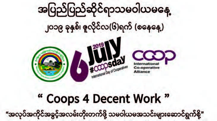 သို့ဆိုရာ မြန်မာ့သမဝါယမများအနေဖြင့် ဘဏ္ဍာရေးဆိုင်ရာ ဝန်ဆောင်မှု အားကောင်းလာစေရေး၊ လယ်ယာကဏ္ဍ ထုတ်လုပ်မှုနှင့် ယင်းကဏ္ဍတွင် အလုပ်အကိုင်အခွင့်အလမ်း ဖန်တီးပေးနိုင်ရေး၊ ကုန်သွယ်ရောင်းဝယ်မှုများတွင် ကူညီ ထောက်ပံ့ပေးနိုင်ရေး၊ အခြားသောကဏ္ဍများတွင်လည်း သင့်တင့်လျောက်ပတ်သော အလုပ်အကိုင်များ ဖန်တီပေးခြင်း တို့ကို တိုးမြှင့်လုပ်ဆောင်ခြင်းတို့ဖြင့် ICA အပြည်ပြည်ဆိုင်ရာ သမဝါယမအဖွဲ့ချုပ်ကြီး၏ တိုက်တွန်းနှိုးဆော်ချက်ကို ပြည့်ဝစွာလိုက်နာ လုပ်ဆောင်ကြလိမ့်မည်ဟု ယုံကြည် လျက် ၂၀၁၉ ခုနှစ်၊ ဇူလိုင်လ (၆) ရက် (စနေနေ့) တွင် ကျရောက်သည့် အပြည်ပြည်ဆိုင်ရာ သမဝါယမနေ့ကို ဂုဏ်ပြုလိုက်ရပါတော့သည်။ ။