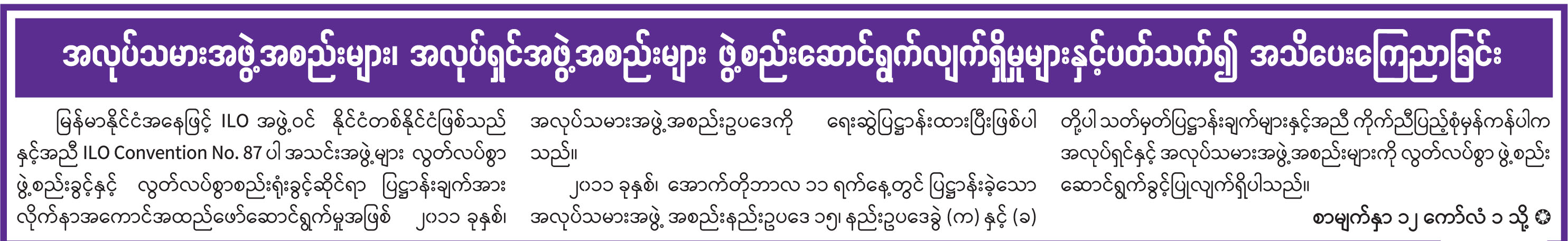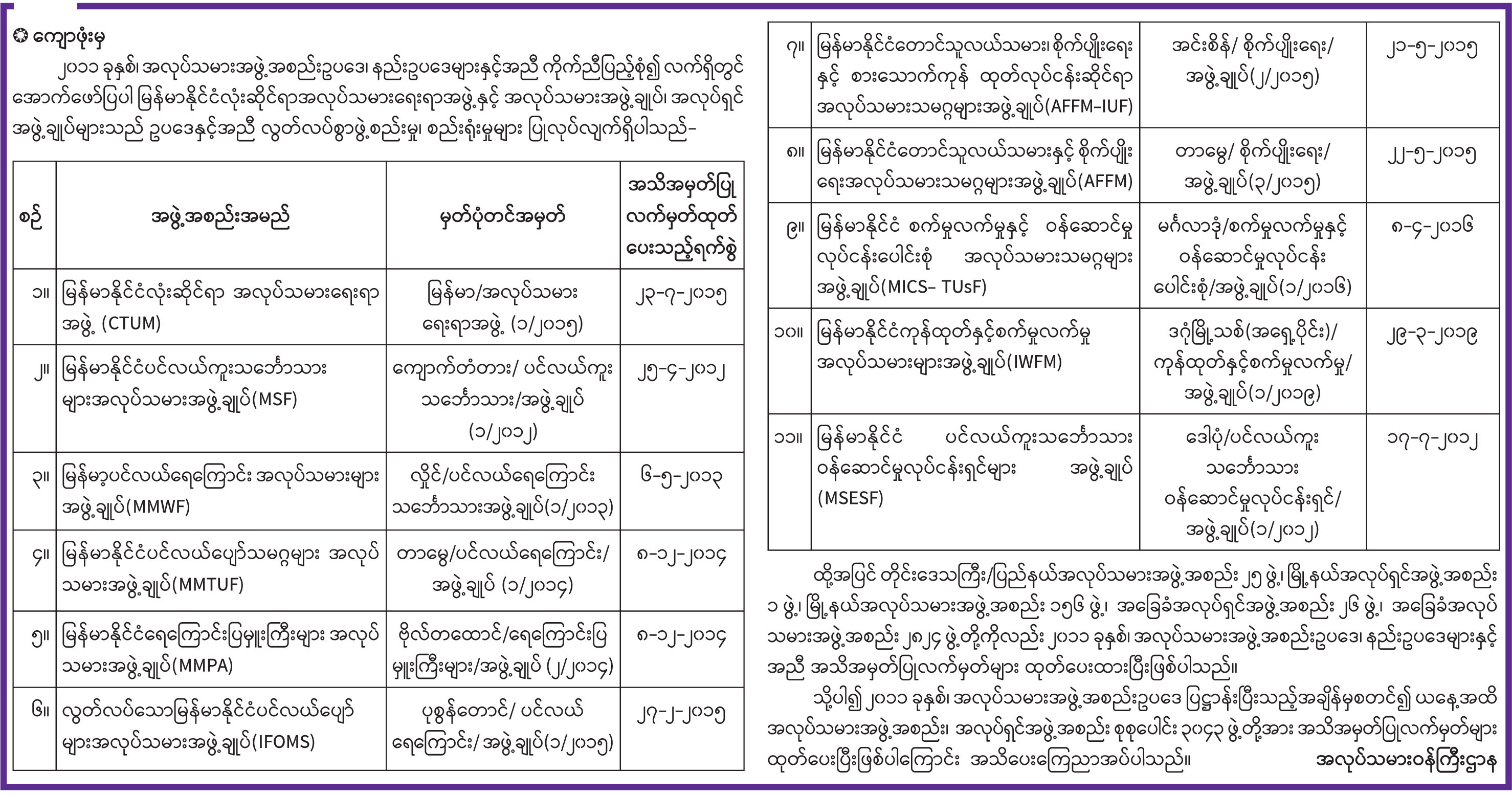 အလုပ်သမားအဖွဲ့အစည်းများ၊ အလုပ်ရှင်အဖွဲ့အစည်းများ ဖွဲ့စည်းဆောင်ရွက်လျက်ရှိမှုများနှင့်ပတ်သက်၍ အသိပေးကြေညာခြင်း