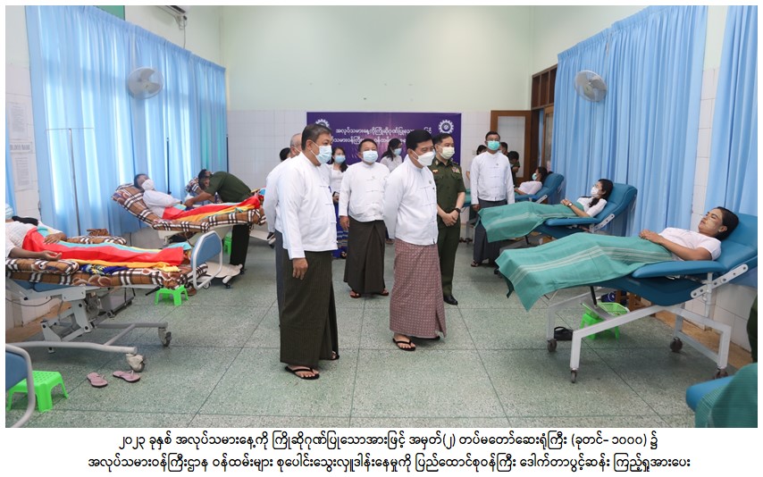 အလုပ်သမားဝန်ကြီးဌာနသည် နိုင်ငံတော်၏ မူဝါဒများနှင့်အညီ အလုပ်ရှင်၊ အလုပ်သမားများ၏အကျိုးကို ဘက်ပေါင်းစုံမှ ဆောင်ရွက်ပေးလျက်ရှိသည့်အပြင် လူမှုကာကွယ်စောင့်ရှောက်ရေးလုပ်ငန်းများကို တစ်ဘက်တစ်လမ်းမှ ဆောင်ရွက်လျက်ရှိရာ ယမန်နေ့က ပြည်သူ့ဆေးရုံကြီး (ခုတင်-၁၀၀၀)၊ နေပြည်တော်၌ ဝန်ထမ်းဦးရေ (၆၀) က စုပေါင်းသွေးလှူဒါန်းခဲ့ပြီး ယနေ့တွင် ဝန်ထမ်းဦးရေ (၄၀) က ထပ်မံလှူဒါန်းခဲ့သည့်အတွက် အလုပ်သမားဝန်ကြီးဌာနအနေဖြင့် စုစုပေါင်းဝန်ထမ်းဦးရေ (၁၀၀) စုပေါင်းသွေးလှူဒါန်းခဲ့ပြီး ဖြစ်သည်။
