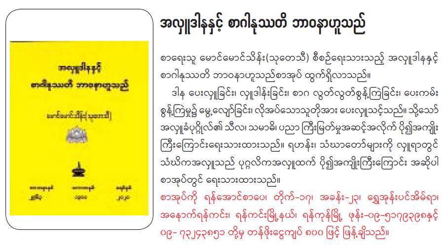 အလှူဒါနနှင့် စာဂါနုဿတိ ဘာဝနာဟူသည် စာအုပ်ထွက်ရှိ