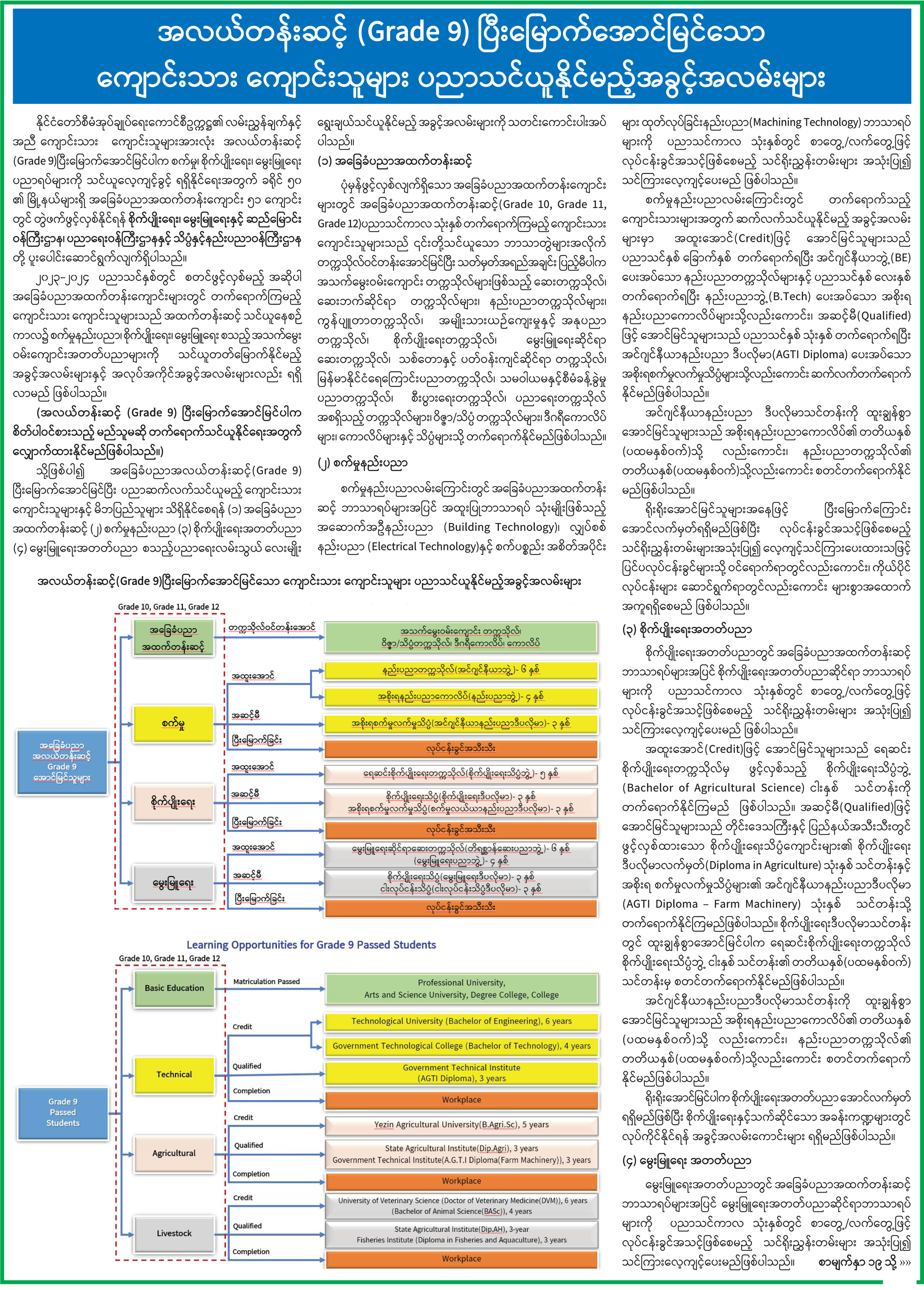 အလယ်တန်းဆင့် (Grade 9) ပြီးမြောက်အောင်မြင်သော ကျောင်းသား ကျောင်းသူများ ပညာသင်ယူနိုင်မည့်အခွင့်အလမ်းများ