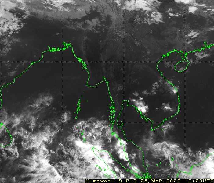 ဘင်္ဂလားပင်လယ်အော်အ‌ခြေအနေ။ ဘင်္ဂလားပင်လယ်အော်တောင်ပိုင်းတွင် တိမ်အသင့်အတင့်မှ တိမ်ထူထပ်နေပြီး၊ ကပ္ပလီပင်လယ်ပြင်နှင့် ကျန်ဘင်္ဂလားပင်လယ်အော်တို့တွင် တိမ်အနည်းငယ် ဖြစ်ထွန်းနေပါသည်။