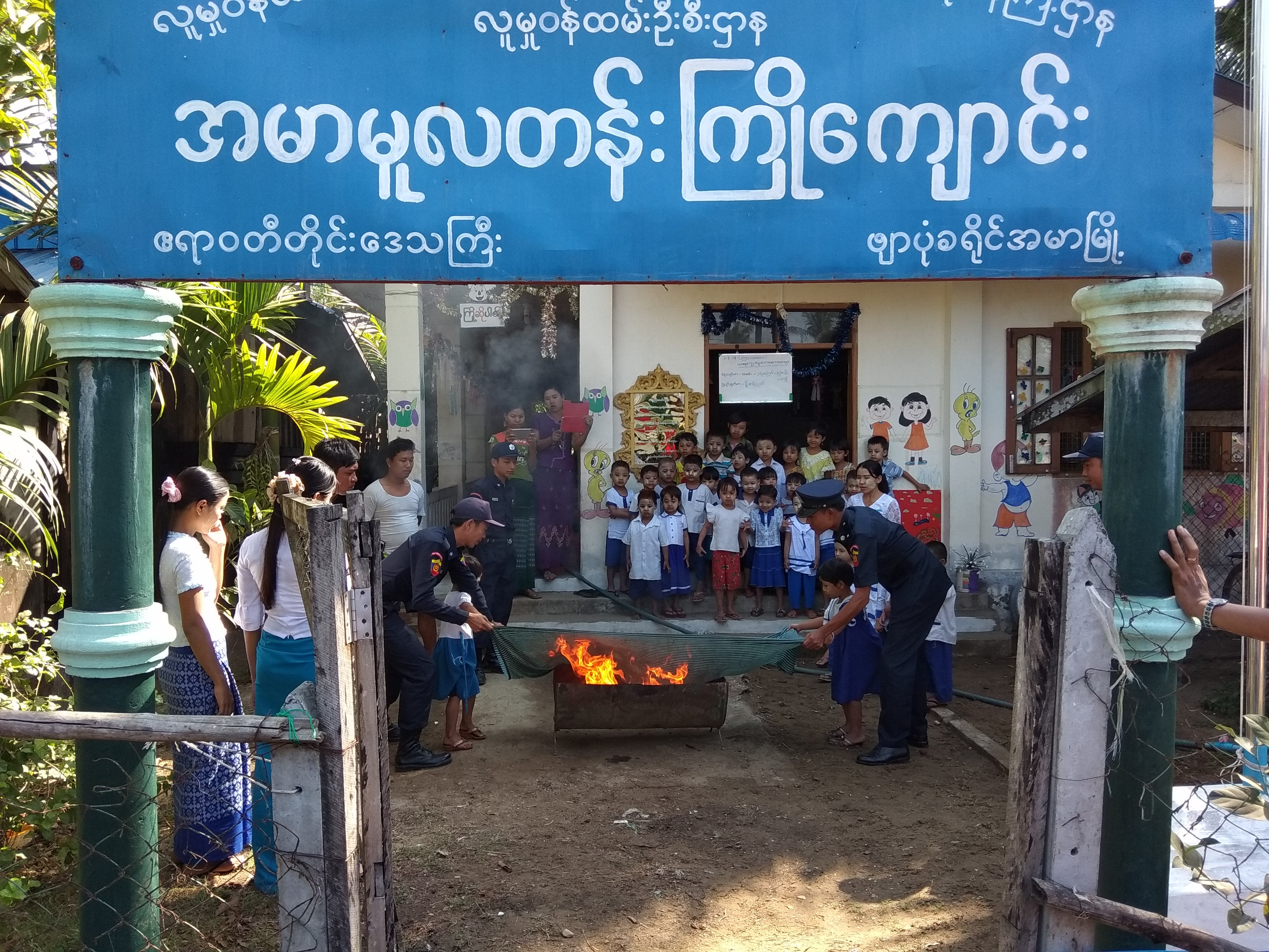 ဧရာဝတီတိုင်းဒေသကြီး ဖျာပုံခရိုင်အမာမြို့ လူမှုဝန်ထမ်းဦးစီးဌာန အမာမူလတန်းကြို ကျောင်းဆရာမကြီး ဒေါ်နွယ်နီနှင့် အမာမီးသတ်စခန်းမီးသတ်ဦးစီးမှူး ဖြိုးကိုကိုဦးတို့ ပူးပေါင်းပြီး မူကြိုကလေးငယ်များနှင့် ဆရာမများ မီးဘေးအရေးပေါ်ကြုံတွေ့လာပါက မီးငြှိမ်းသတ်နိုင်စေရန် ယနေ့ နံနက် ၉ နာရီခွဲက မူလတန်းကြိုကျောင်းရှေ့တွင် လက်တွေ့မီးငြှိမ်းသတ်သရုပ်ပြခဲ့ကြောင်း သိရသည်။