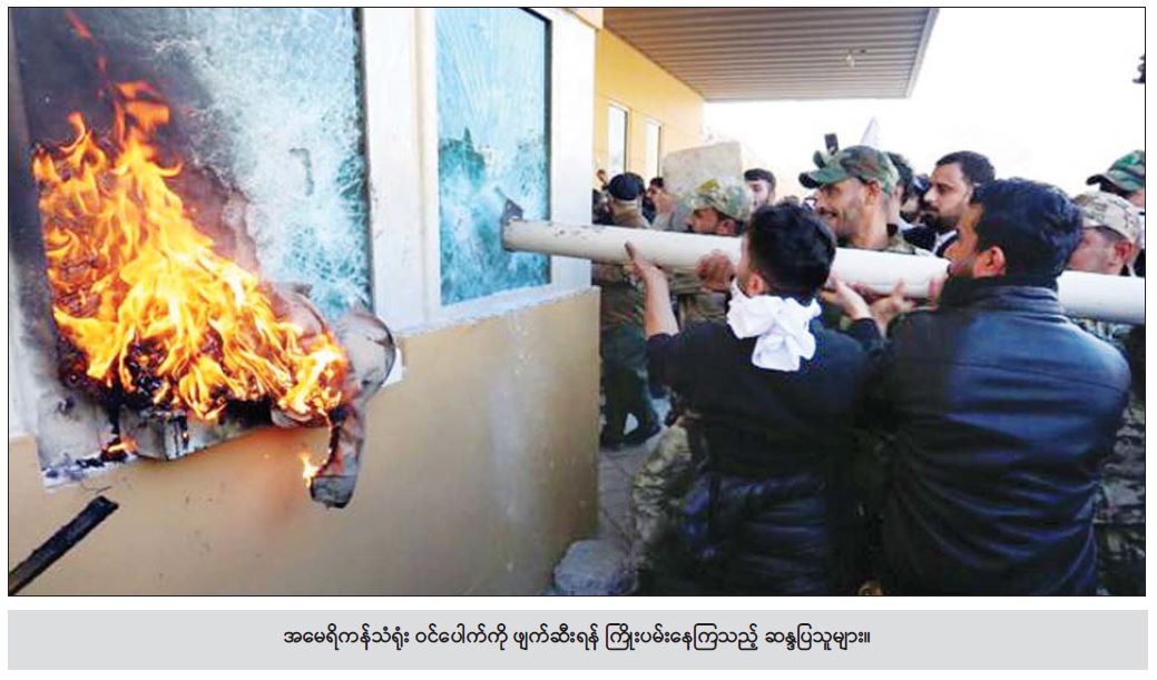ပြီးခဲ့တဲ့ရက်ပိုင်းအတွင်း အမေရိကန်ကလုပ်ဆောင်ခဲ့တဲ့ လေကြောင်း တိုက်ခိုက်မှုကြောင့် ပြည်သူ့စစ်အဖွဲ့ဝင်တွေ သေဆုံးမှုအပေါ် မခံမရပ်နိုင်အောင် ဖြစ်ခဲ့ကြတဲ့ အီရတ်ဆန္ဒပြပြည်သူ လူအုပ်ကြီးက မြို့တော်ဘဂ္ဂဒက်ရှိ အမေရိကန်သံရုံး အဆောက်အအုံဝင်းကို ဒေါသတကြီး တိုက်ခိုက်ခဲ့ကြတာ ဖြစ်ပါတယ်။