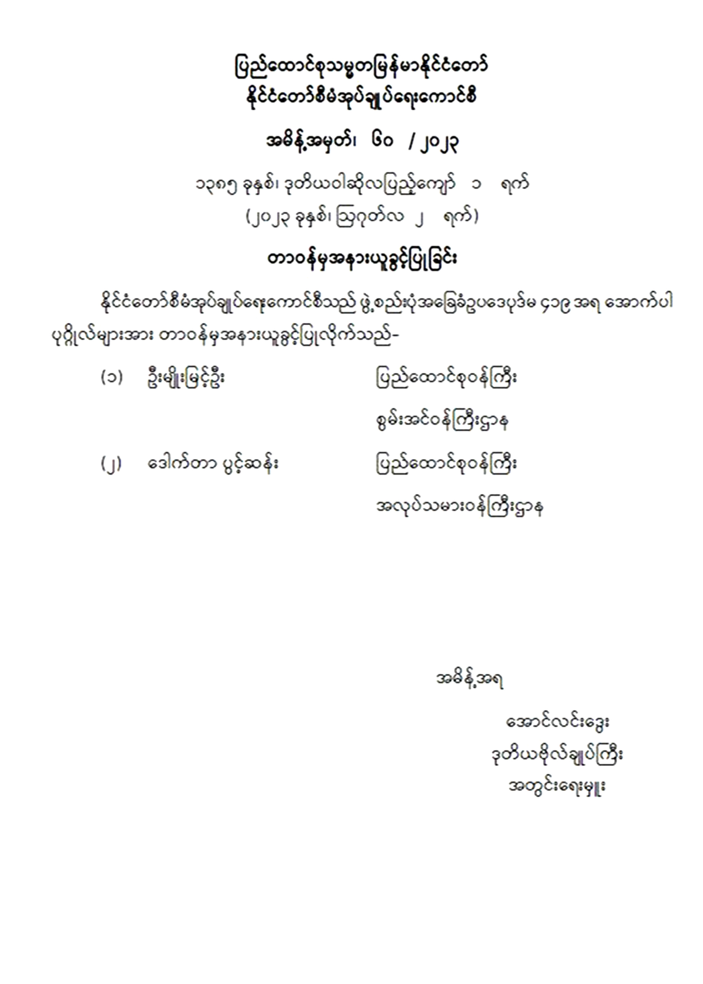 အမိန့်အမှတ်၊ ၆၀ /၂၀၂၃ တာဝန်မှအနားယူခွင့်ပြုခြင်း