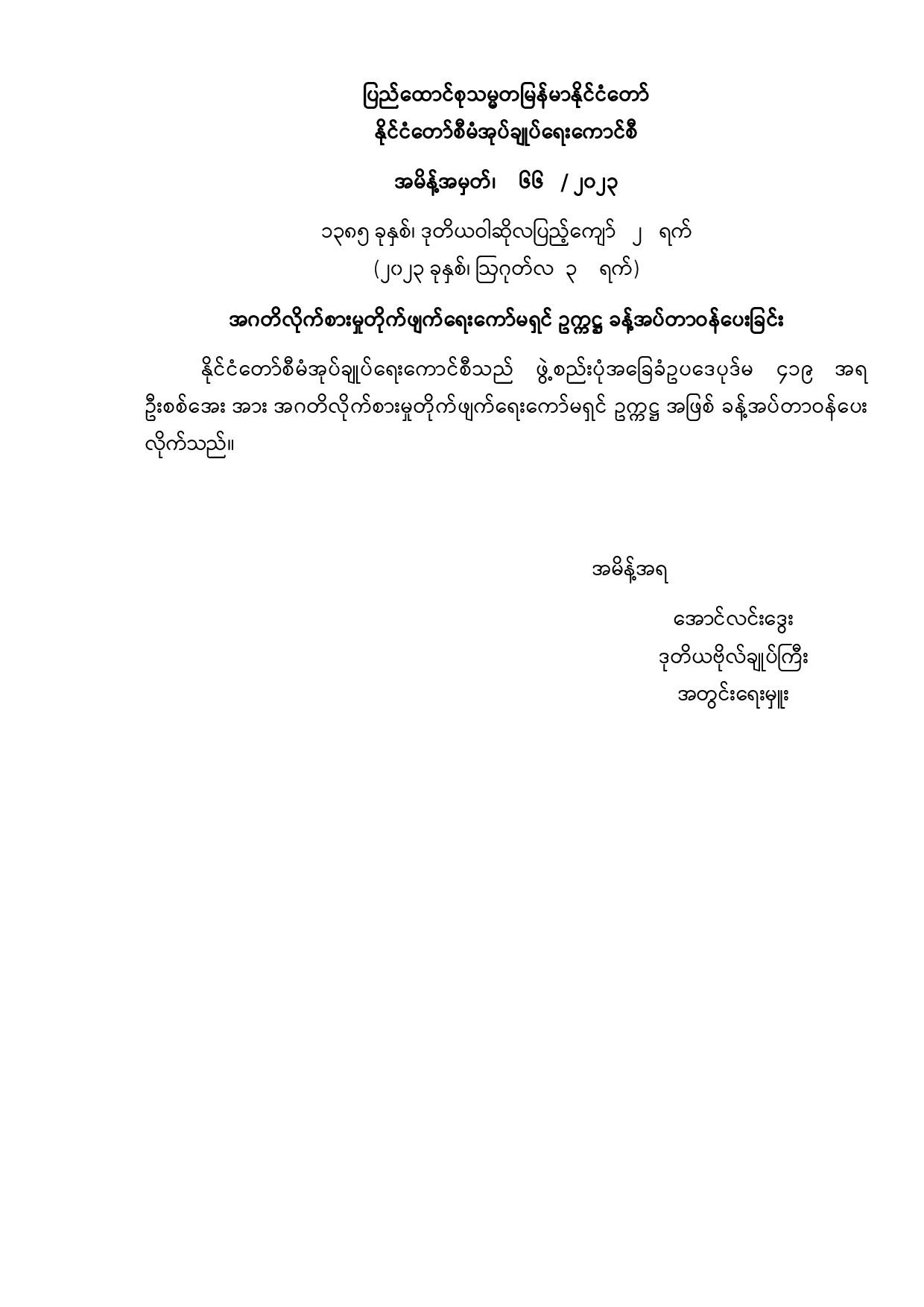 အမိန့်အမှတ်၊ ၆၆ / ၂၀၂၃ အဂတိလိုက်စားမှုတိုက်ဖျက်ရေးကော်မရှင် ဥက္ကဋ္ဌ ခန့်အပ်တာဝန်ပေးခြင်း