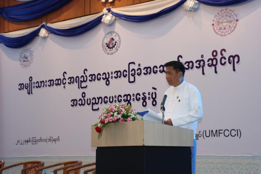 ဆွေးနွေးပွဲတွင် အမျိုးသားစံချိန်စံညွှန်းကောင်စီဥက္ကဋ္ဌ သိပ္ပံနှင့်နည်းပညာဝန်ကြီးဌာန ပြည်ထောင်စုဝန်ကြီး ဒေါက်တာမျိုးသိန်းကျော်နှင့် ပြည်ထောင်စုသမ္မတမြန်မာနိုင်ငံ ကုန်သည်များ နှင့် စက်မှုလက်မှုလုပ်ငန်းရှင်များအသင်းချုပ်ဥက္ကဌ ဦးဇော်မင်းဝင်းတို့က အမှာစကားများ ပြောကြား ကြသည်။