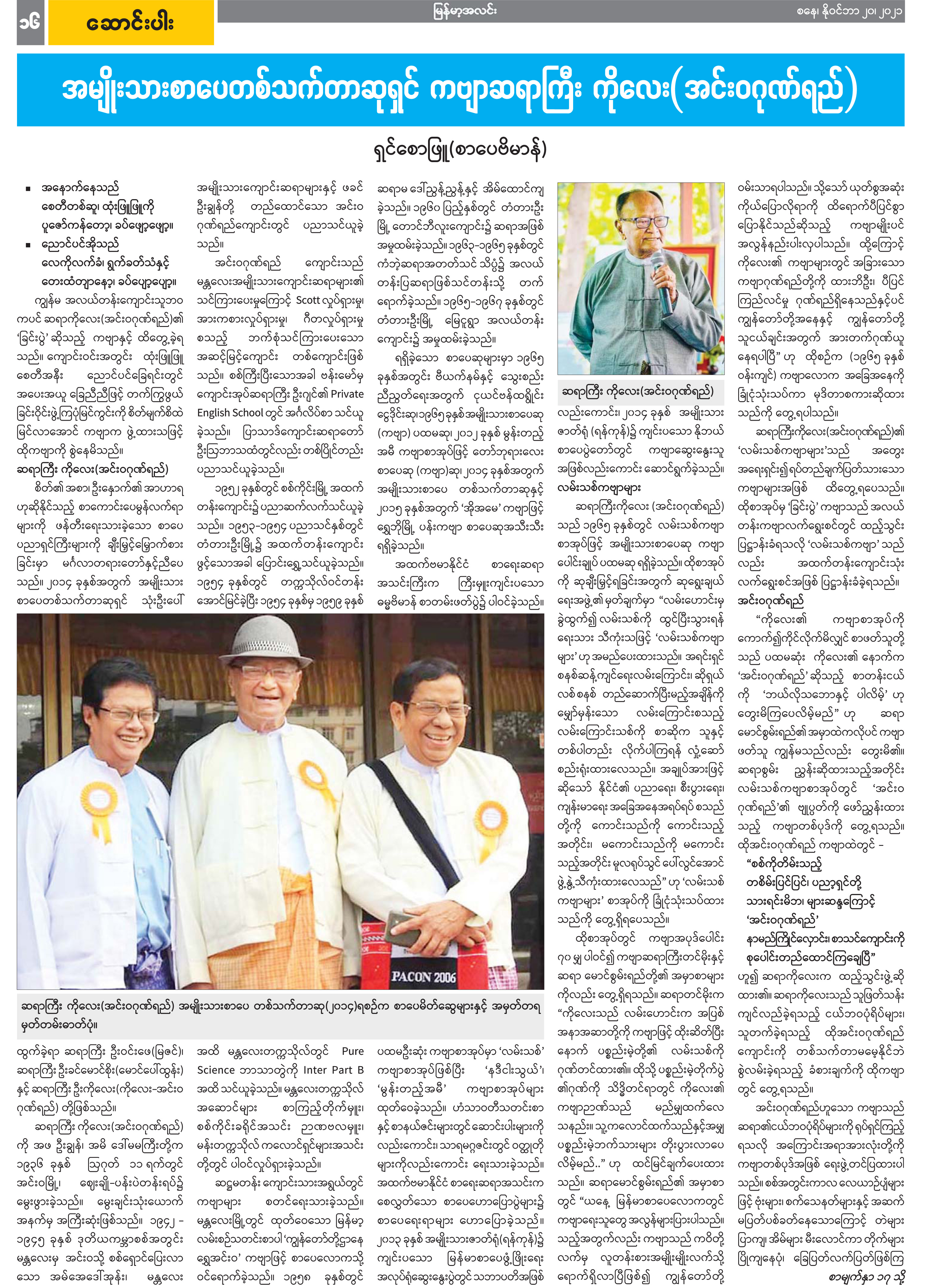 အမျိုးသားစာပေ တစ်သက်တာဆုရှင် ကဗျာဆရာကြီး ကိုလေး(အင်းဝဂုဏ်ရည်)