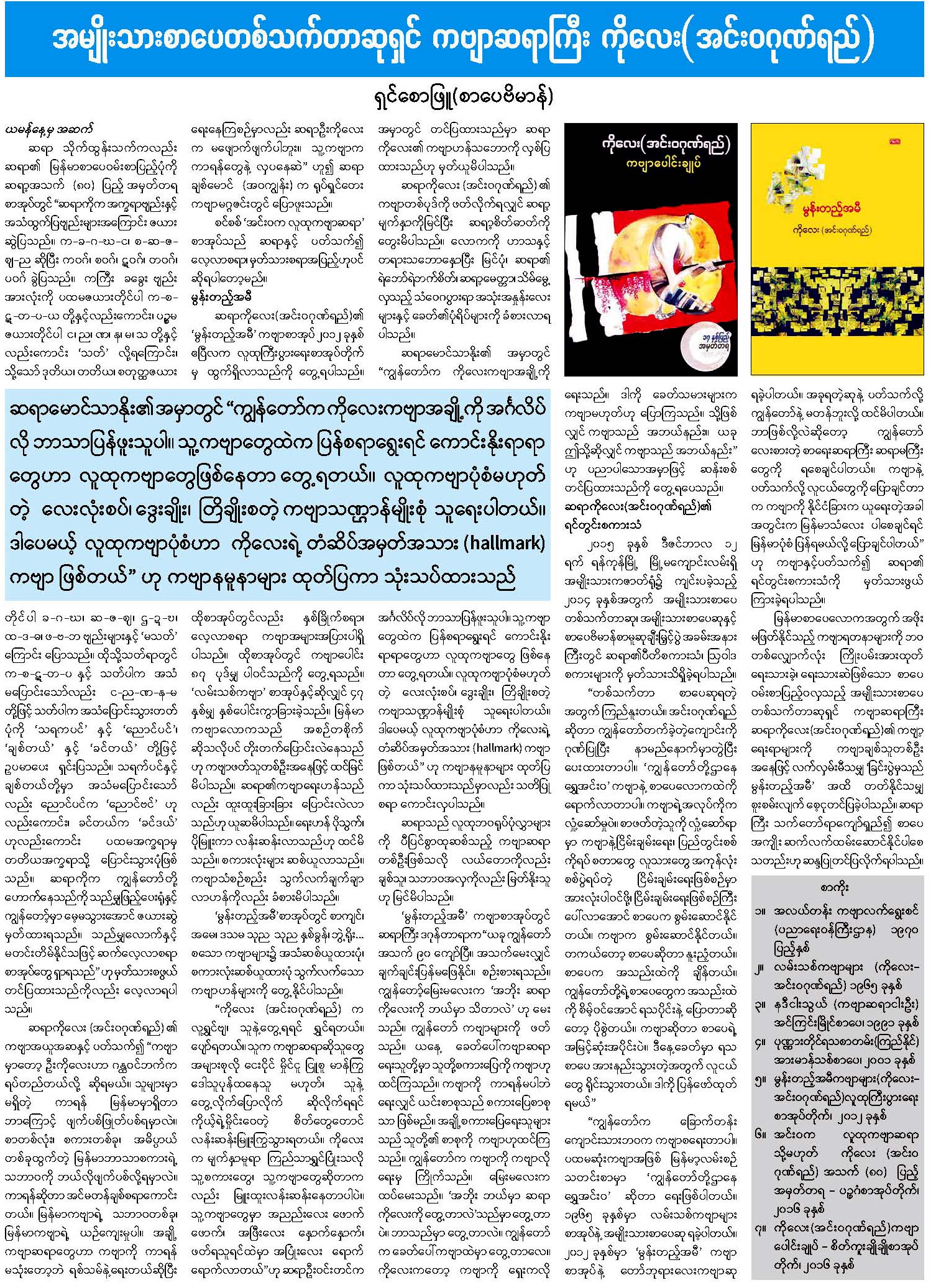 အမျိုးသားစာပေတစ်သက်တာဆုရှင် ကဗျာဆရာကြီး ကိုလေး(အင်းဝဂုဏ်ရည်)