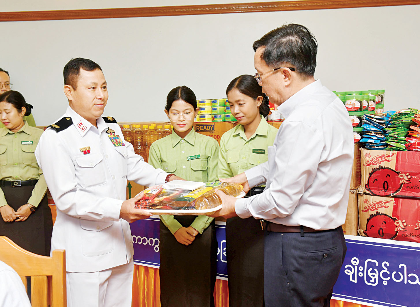 ထို့နောက် အမှုဆောင်ချုပ်က နိုင်ငံတော်ကာကွယ်ရေးနှင့် လုံခြုံရေးတာဝန်ထမ်းဆောင်လျက်ရှိသော တပ်ဖွဲ့ဝင်များအတွက် စားသောက်ဖွယ်ရာများကို ပေးအပ်ချီးမြှင့်သည်။