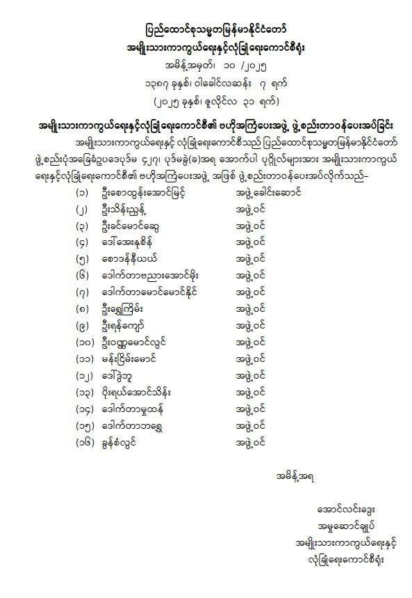 အမျိုးသားကာကွယ်ရေးနှင့်လုံခြုံရေးကောင်စီ၏ ဗဟိုအကြံပေးအဖွဲ့ ဖွဲ့စည်းတာဝန်ပေးအပ်