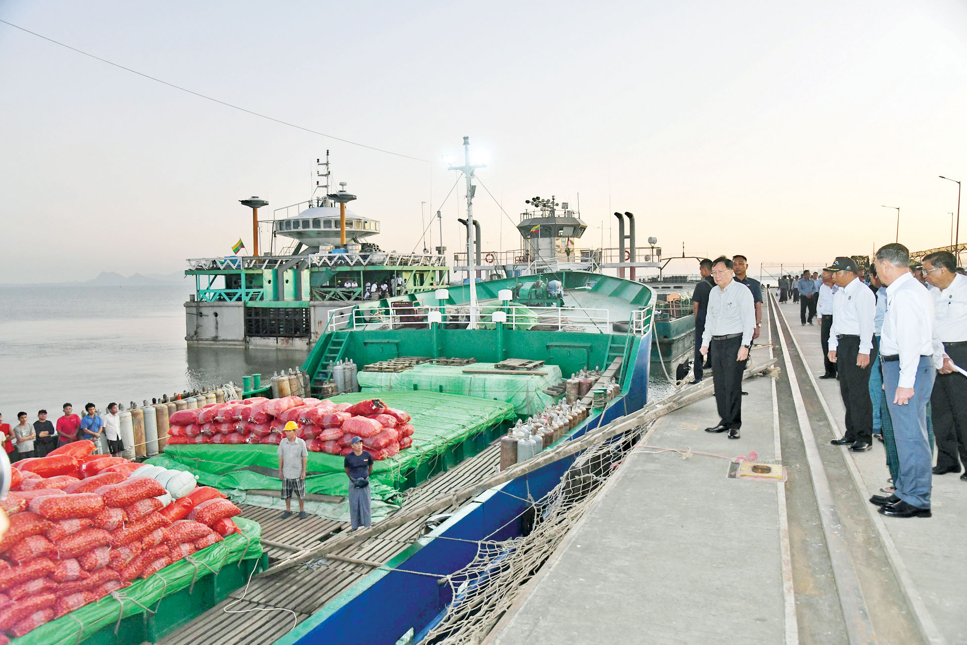 ထိုသို့ ကြည့်ရှုစစ်ဆေးစဉ် ပြည်နယ်ဝန်ကြီးချုပ်နှင့် ပြည်နယ်ဆိပ်ကမ်းအရာရှိချုပ်တို့က ဘက်စုံသုံးဆိပ်ကမ်းအတွင်း သင်္ဘောများဆိပ်ကမ်းရောက်ရှိမှု အခြေအနေ၊ ကုန်တင်ကုန်ချပြုလုပ်နေမှု အခြေအနေ၊ ဆိပ်ကမ်း၏ ရေစူးအတိမ်အနက်အခြေအနေကို ရှင်းလင်းတင်ပြကြရာ ရှင်းလင်းတင်ပြချက်များပေါ် အမှုဆောင်ချုပ်က လိုအပ်သည်များကို လမ်းညွှန်မှာကြားပြီး ဆိပ်ကမ်းတစ်လျှောက် လှည့်လည်ကြည့်ရှုစစ်ဆေးကြသည်။